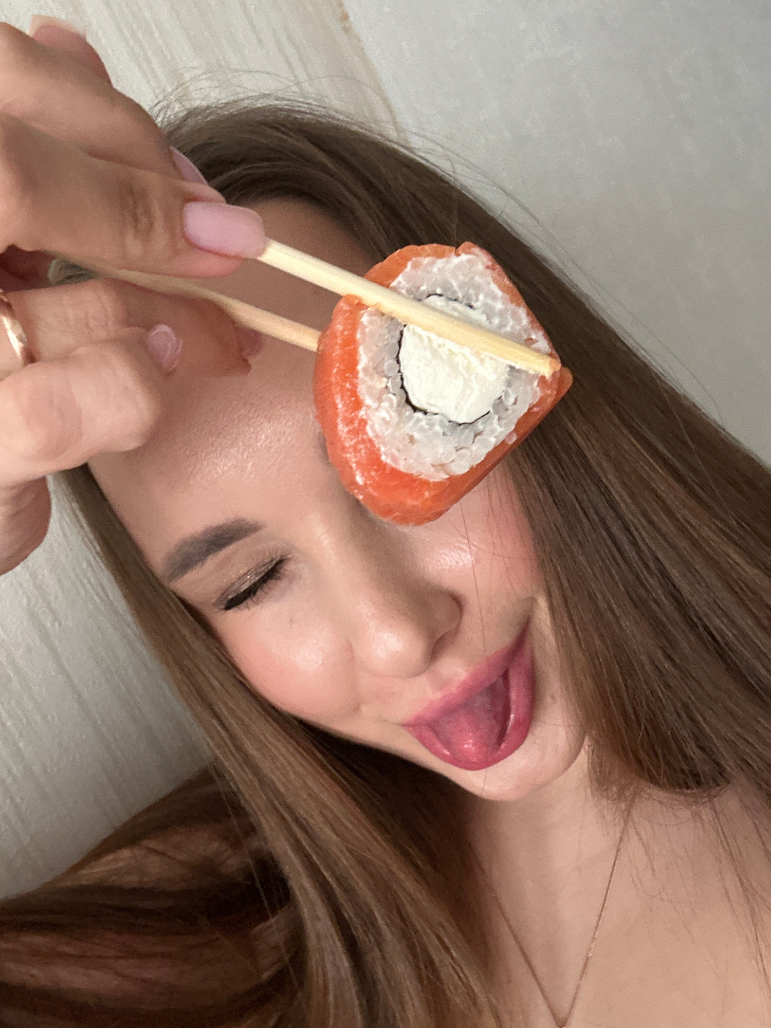 A young woman is lying on her side with her eyes closed and mouth slightly open, holding a piece of sushi with chopsticks near her face. The sushi roll is wrapped in salmon and has a white filling. Sh…read more