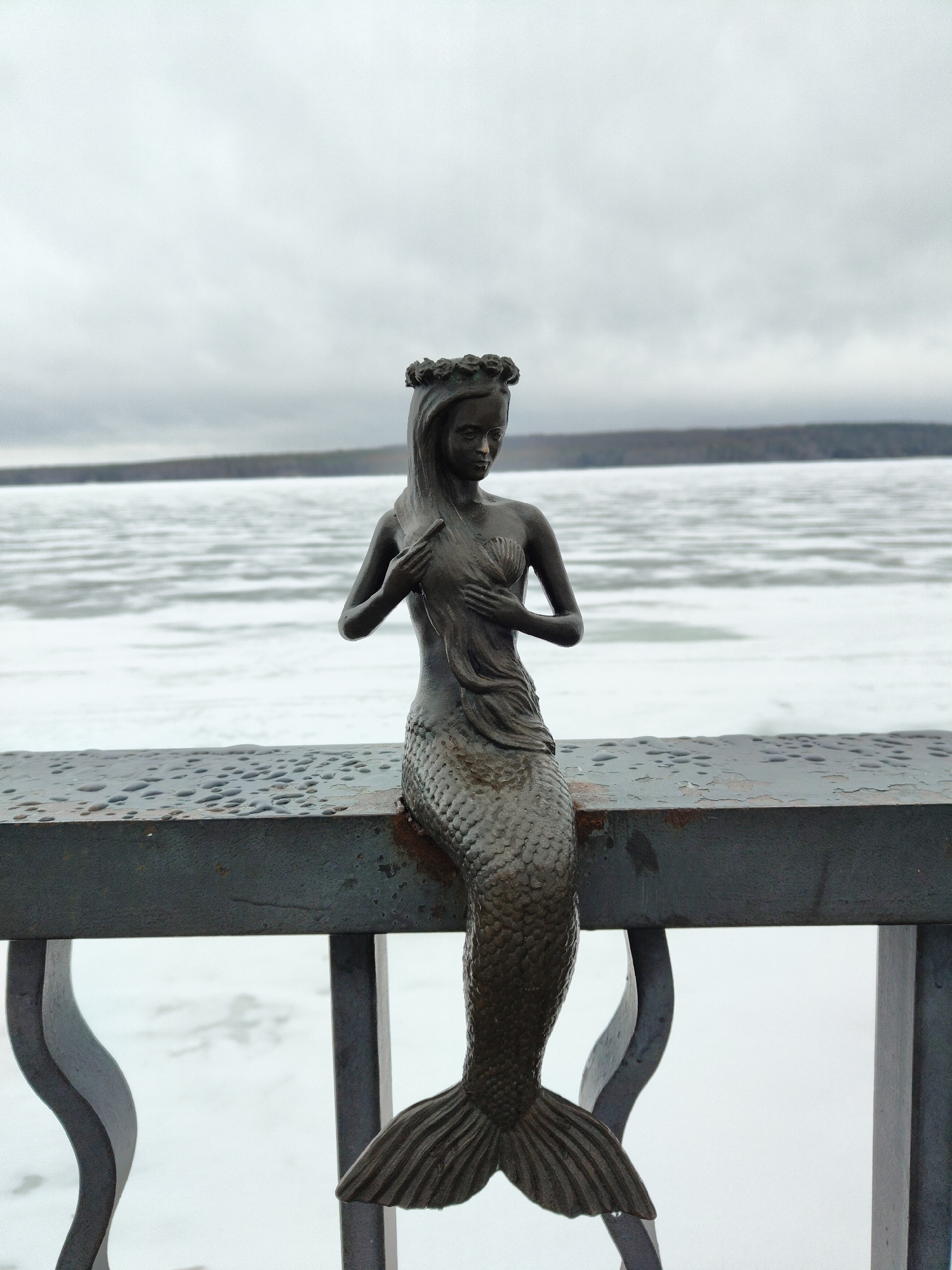 A bronze-colored mermaid statue sits on a metal railing overlooking a frozen, snow-covered body of water. The statue has a wreath on its head and long hair. The sky is overcast. The location is unknow…read more