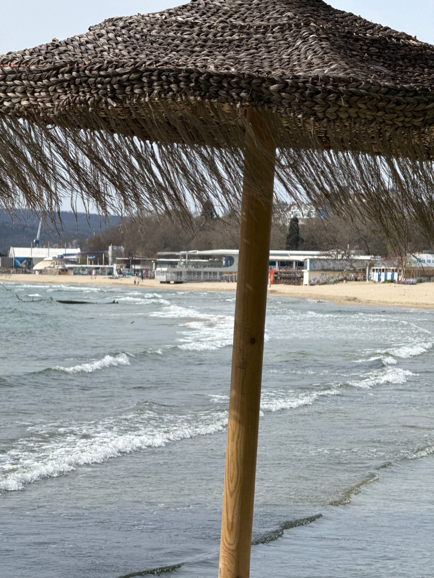 The image depicts a beach scene in Varna, Bulgaria, as viewed from under a straw beach umbrella. The umbrella is in the foreground, showing its thatched texture and wooden pole. Beyond the umbrella, t…read more