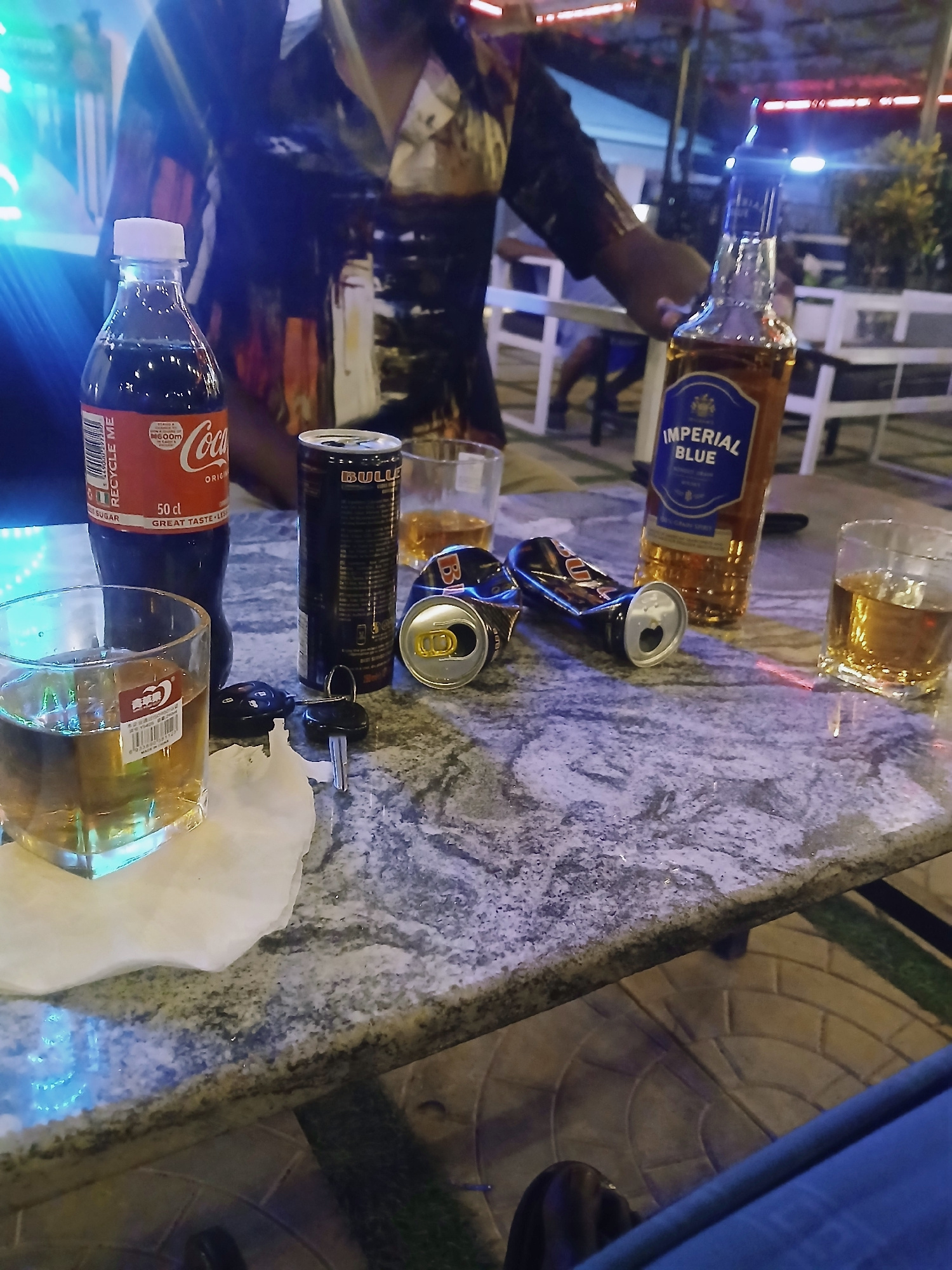 The image shows a bar or restaurant table in Jos, Nigeria, littered with alcoholic beverages and associated items. There is a partially full bottle of Imperial Blue whiskey, two empty and crushed cans…read more