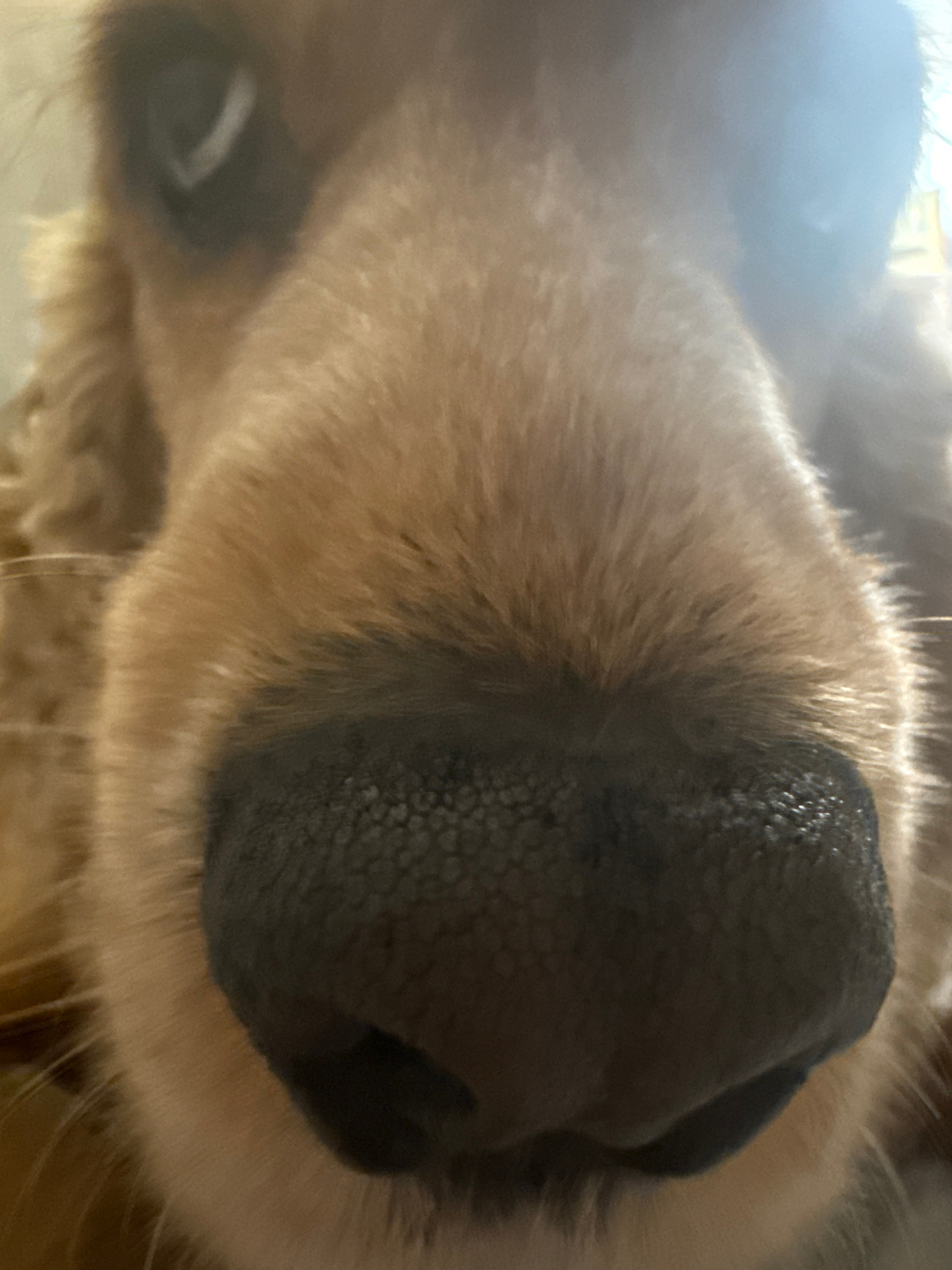 An extreme close-up shot captures the face of a light brown or golden-furred dog, focusing prominently on its wet, textured black nose. The nose dominates the right and central portions of the frame,…read more