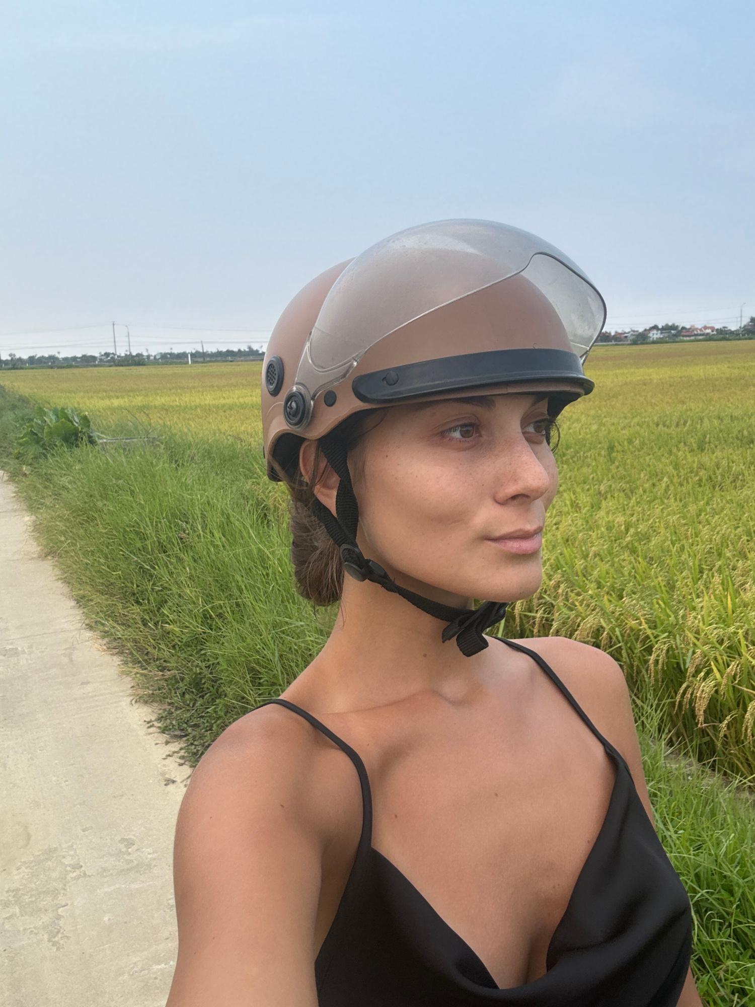 A close-up, portrait-oriented shot features a person, likely female, captured from the chest up. She is wearing a light brown or beige open-face helmet with a clear visor, secured by a black chin stra…read more