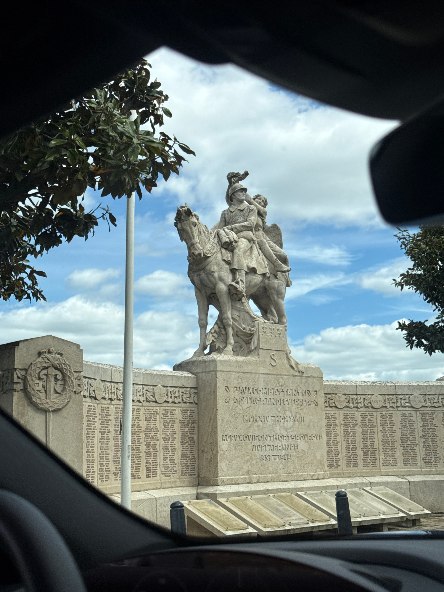 The image depicts the Monument aux Morts (War Memorial) of Saumur, France, as seen through the frame of a vehicle window. The statue group atop the memorial shows a figure on horseback. The memorial's…read more