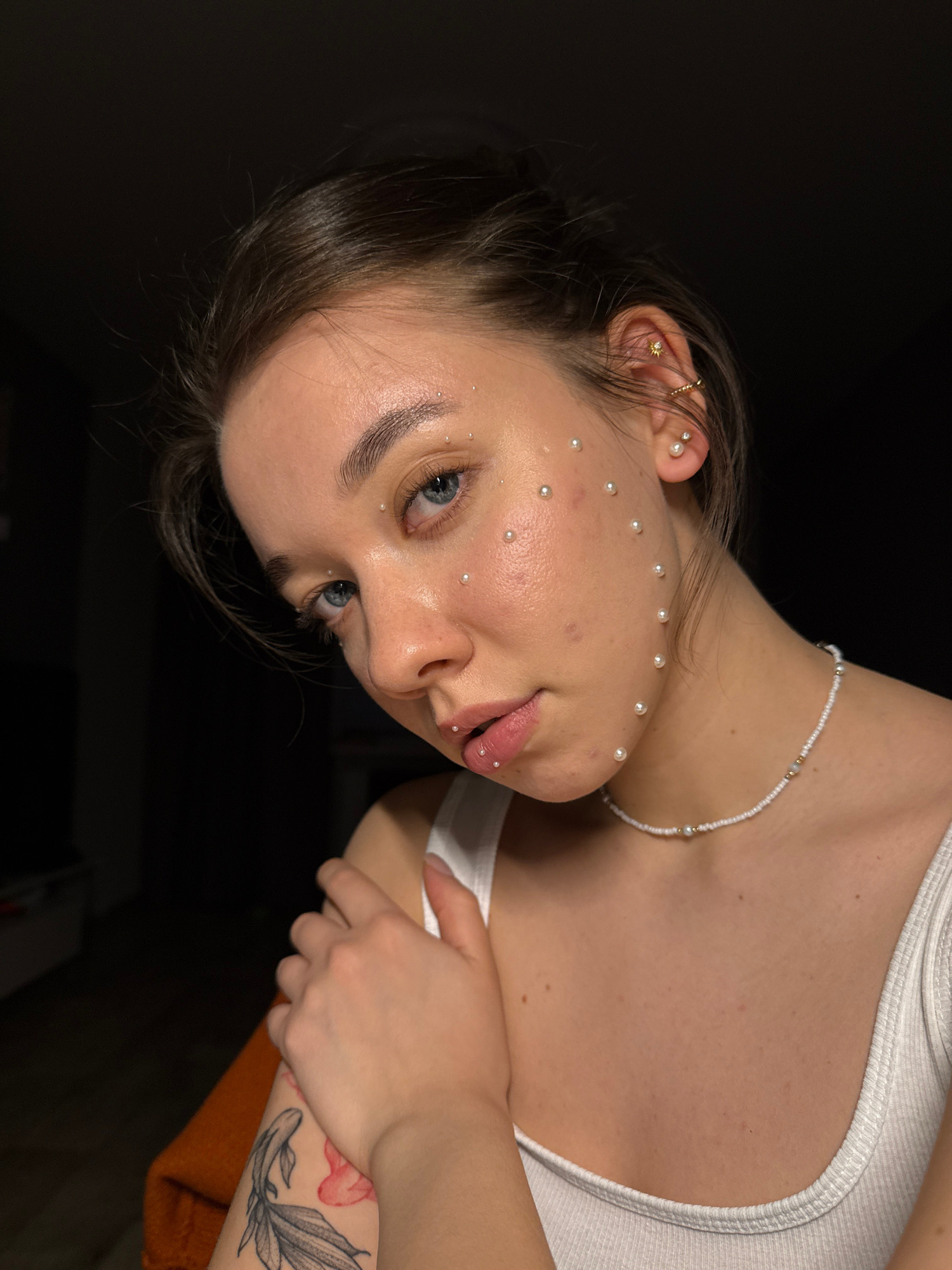 A young woman with light skin and blue eyes is seen in a low-light setting. She is wearing a white tank top and a beaded necklace. Multiple small, white pearls are adhered to her face. The woman has a…read more