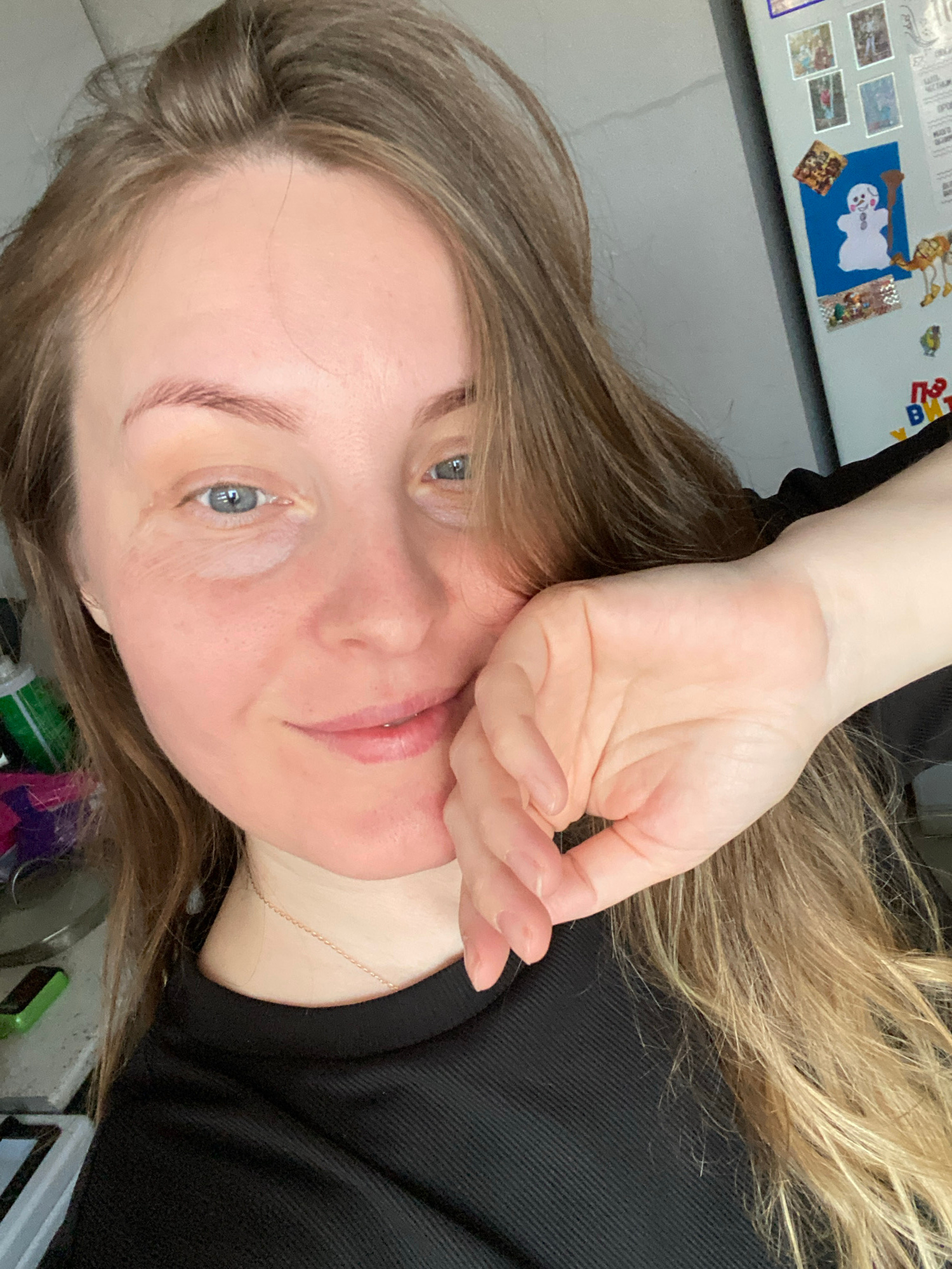 A woman with blonde hair and blue eyes is looking at the camera with her hand near her face. She is wearing a black shirt. In the background, there is a refrigerator with magnets on it. The location i…read more