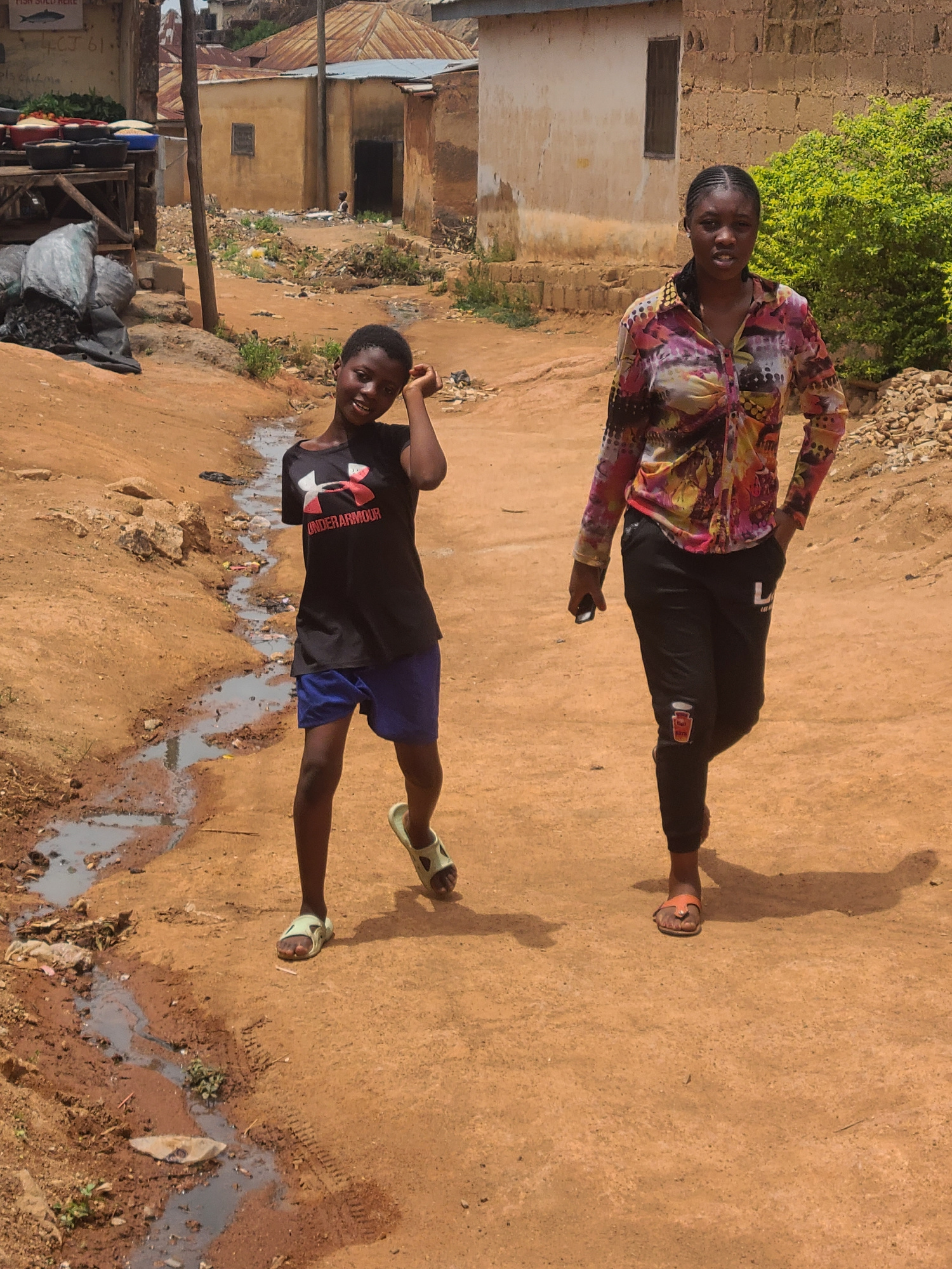 Two individuals are depicted in an outdoor setting. One is wearing a long-sleeved, multi-colored top with dark pants, while the other wears a dark t-shirt with blue shorts. The background features bui…read more