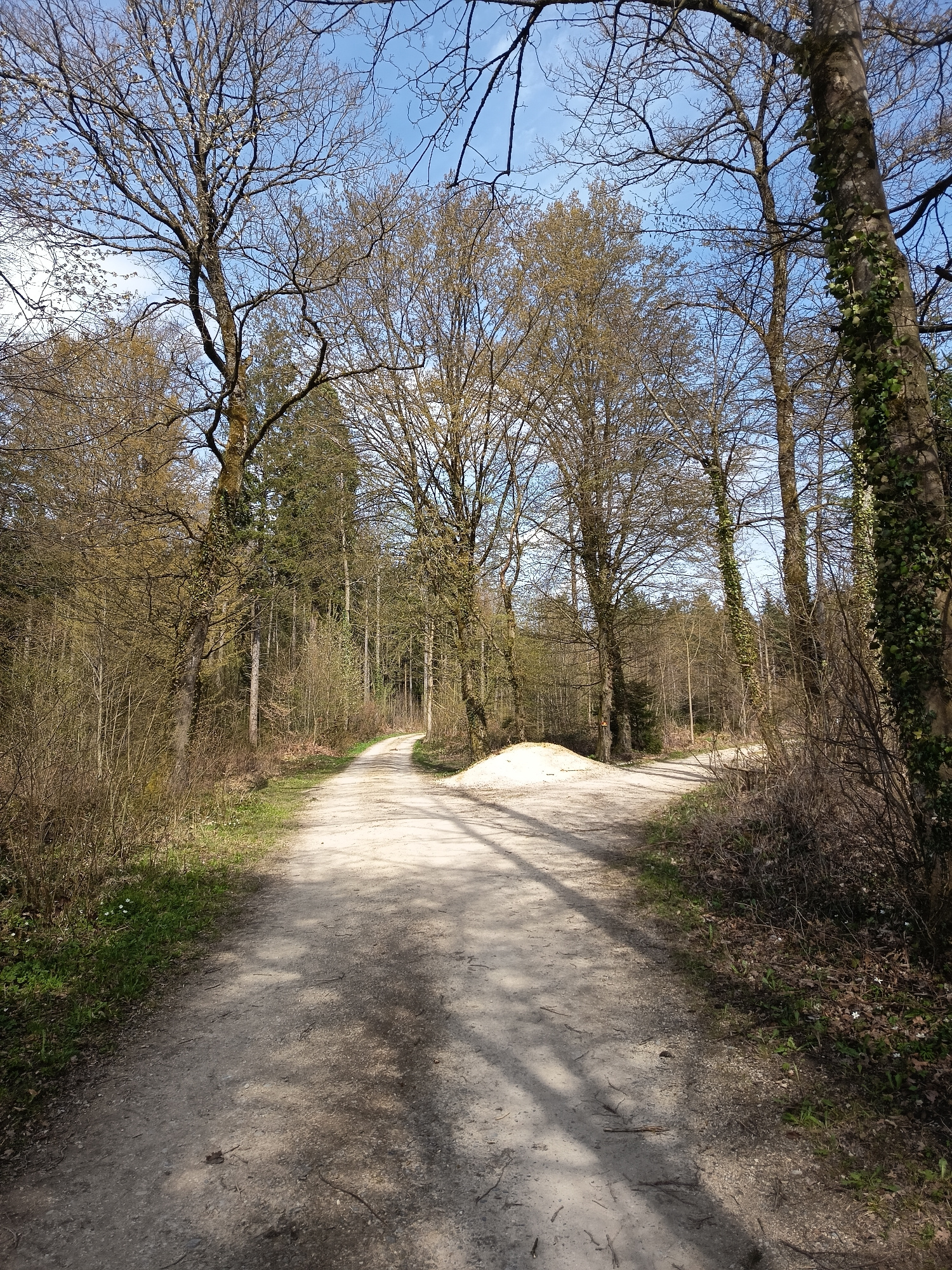 The image shows a dirt path branching into two directions in a forest setting. The path is light-colored and appears to be well-worn. Trees line both sides of the path, with some displaying bare branc…read more