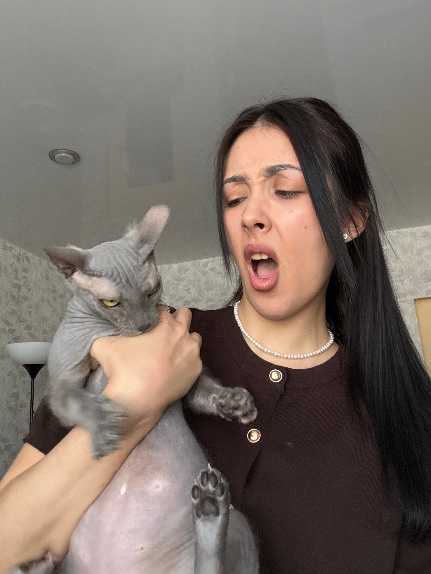 A woman with long, dark hair is holding a gray Sphynx cat. She is wearing a brown cardigan with gold buttons and a pearl necklace. Her face is contorted in an expression of exaggerated disgust or anno…read more