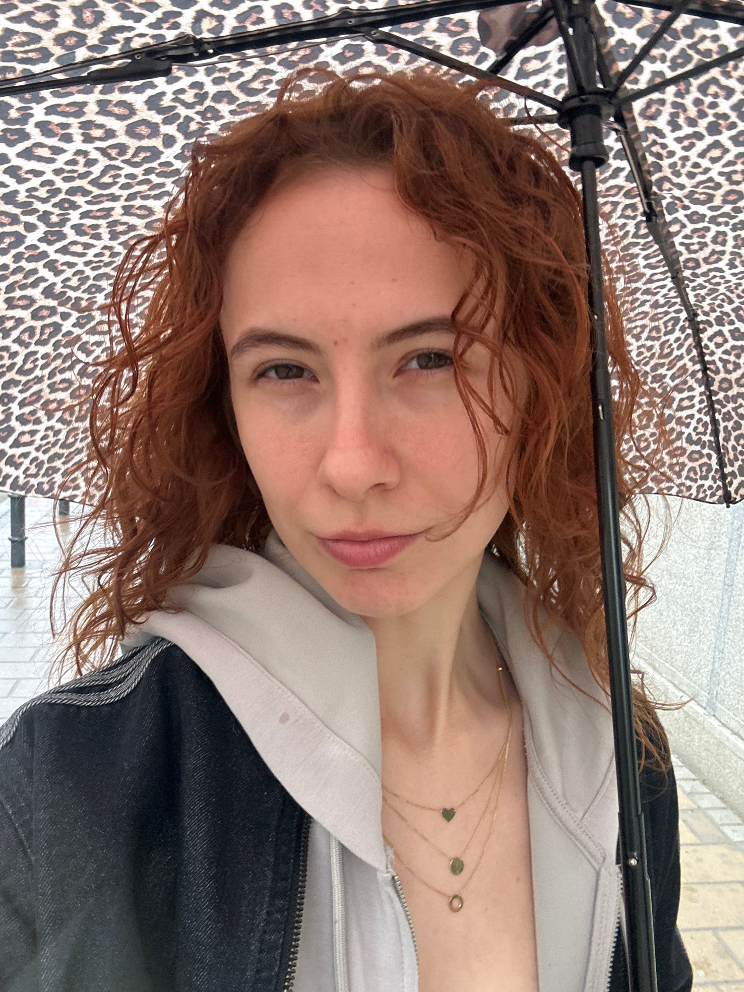 A selfie taken by a woman with red, curly hair under a leopard-print umbrella. The woman is fair-skinned with light-colored eyes. She is wearing a light-colored hoodie with a dark denim jacket over it…read more