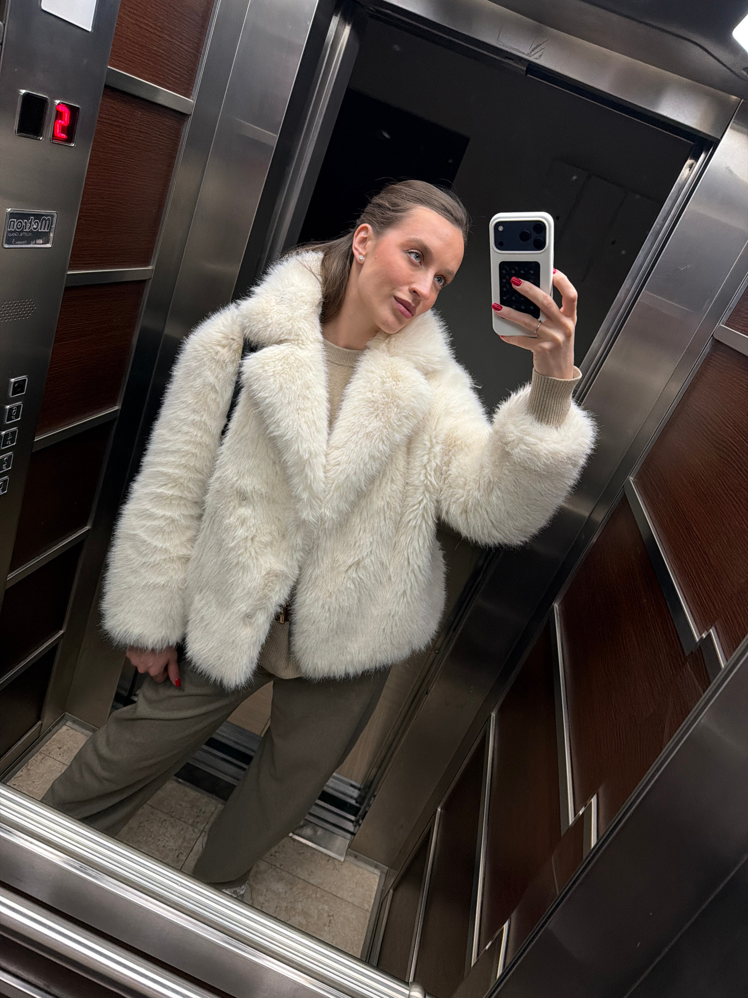 The photograph, taken inside an elevator, depicts a woman holding a white smartphone and capturing a selfie. She is wearing a plush, off-white jacket over a light-colored top and olive-green pants. Th…read more
