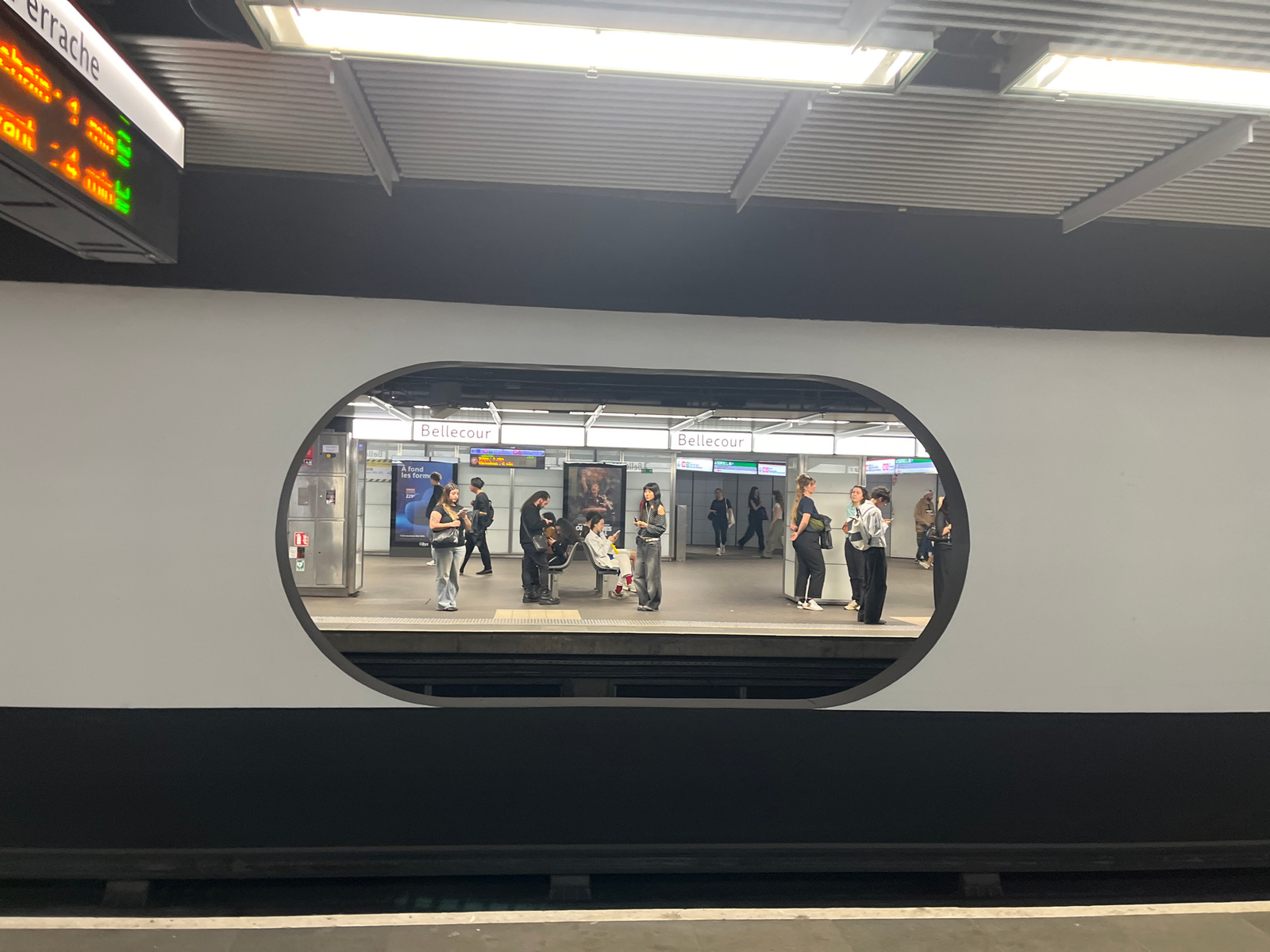 The image shows a view of the Bellecour metro station platform in Lyon, France, as seen through an oval-shaped window on the side of a metro train. Several people are standing or sitting on benches on…read more