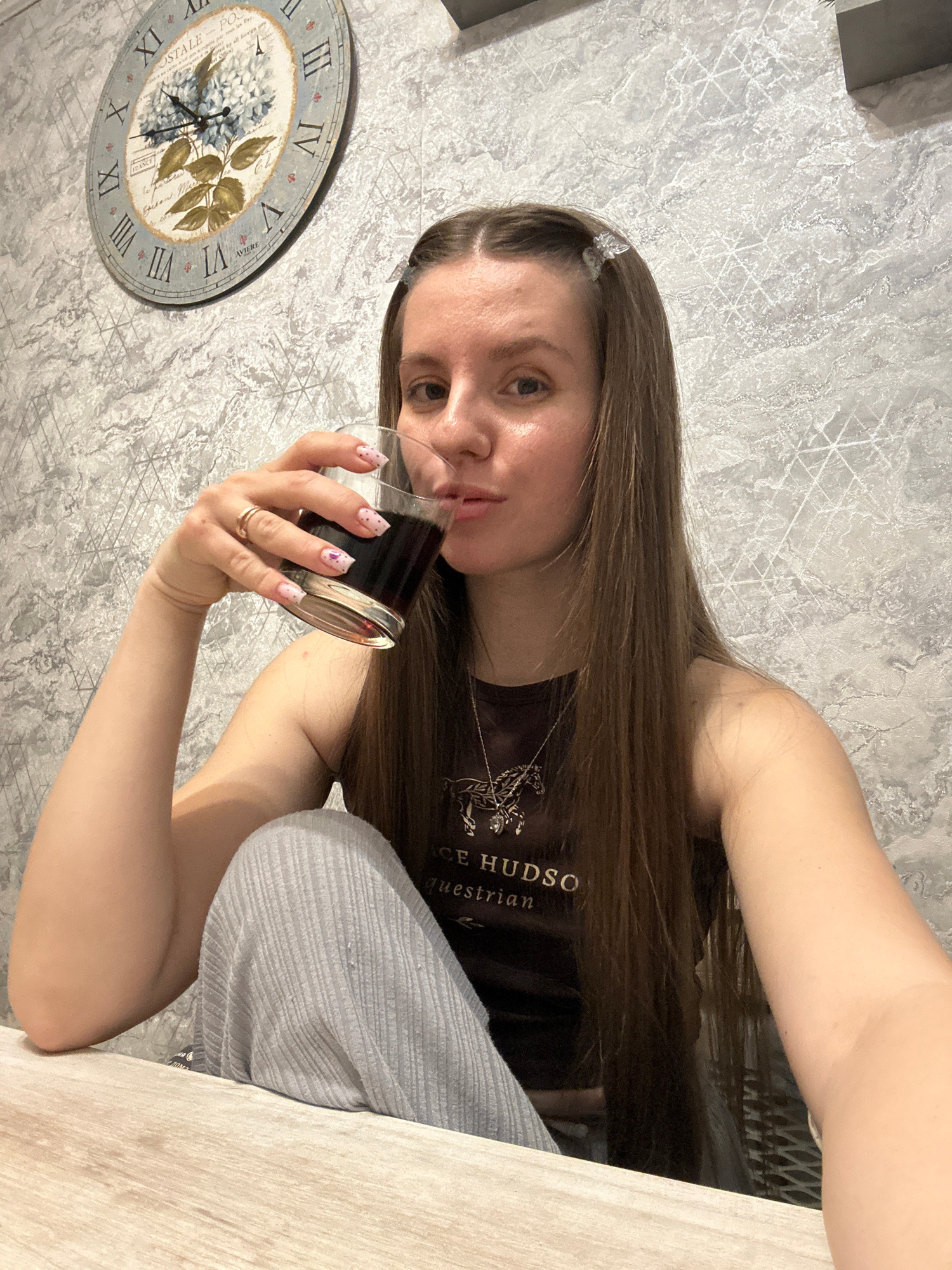 A woman with long brown hair is holding a glass of dark liquid, possibly wine or juice. She is wearing a dark brown t-shirt with "LACE HUDSO equestrian" printed on it. Her nails are manicured with a l…read more
