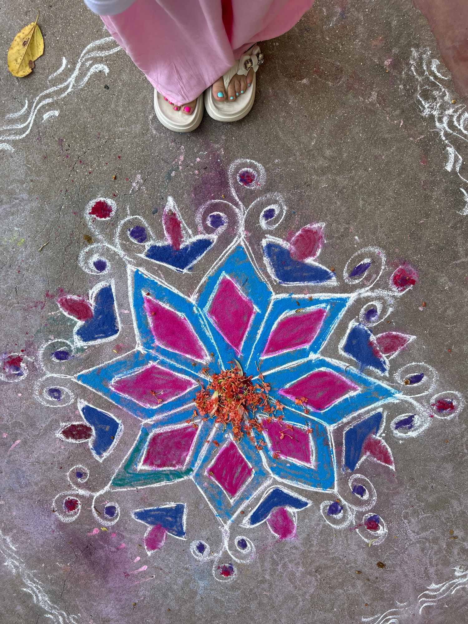 The image shows a colorful, star-shaped rangoli design on a gray concrete surface, likely outdoors. The design is created with pink, blue, and white chalk or powder, and decorated with scattered red-o…read more