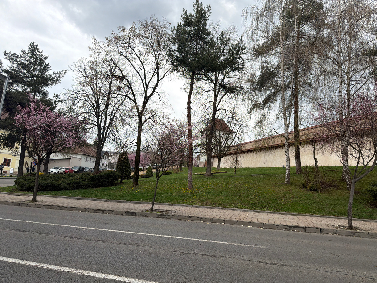 The image shows a street scene in Târgu Mureș, Romania. A two-lane road with white lane markings is in the foreground. A sidewalk with brick pavers runs along the right side of the road. Beyond the si…read more
