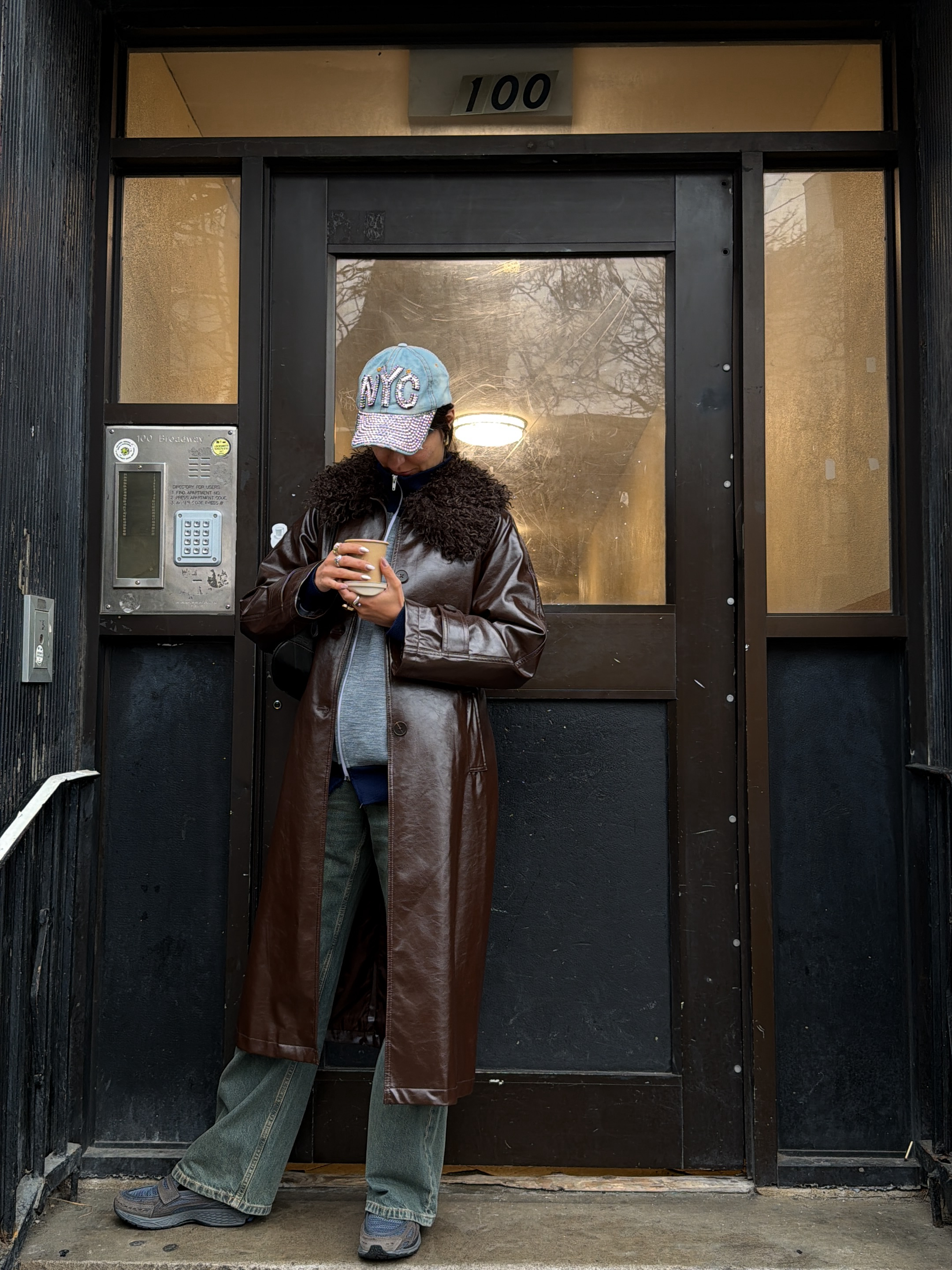A full-length shot shows a woman standing in front of a brown door in New York City. The door, bearing the number "100" above the entrance, features an intercom system to the left. The woman is wearinβ¦read more