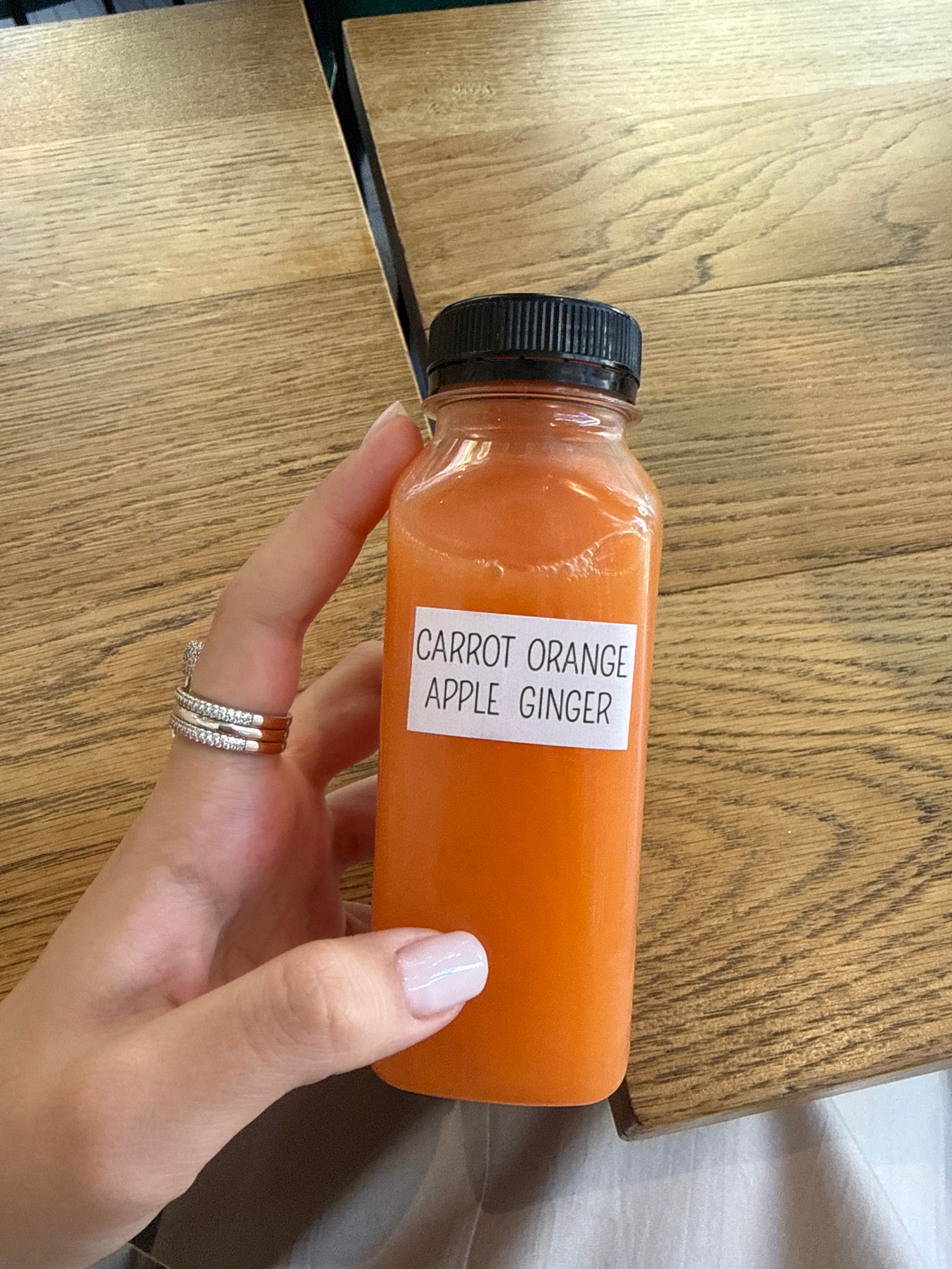 A hand holds a plastic bottle of orange juice labeled "Carrot, Orange, Apple, Ginger." The bottle has a black cap. The hand has several rings on the ring finger. The background is a wooden table with…read more