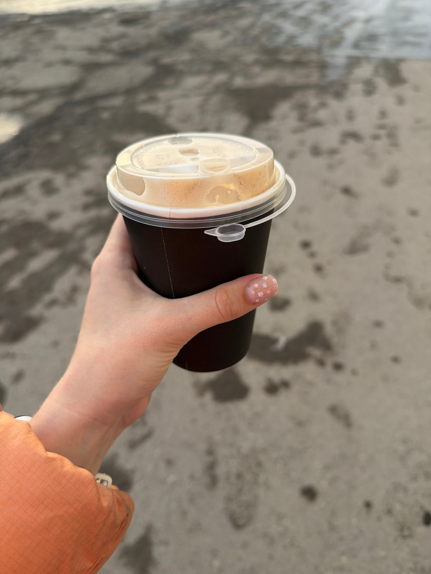 A hand holds a cup of iced coffee with a plastic lid against a blurred background. The hand is pale with floral nail art on the thumb. Part of an orange sleeve is visible on the right. The background…read more