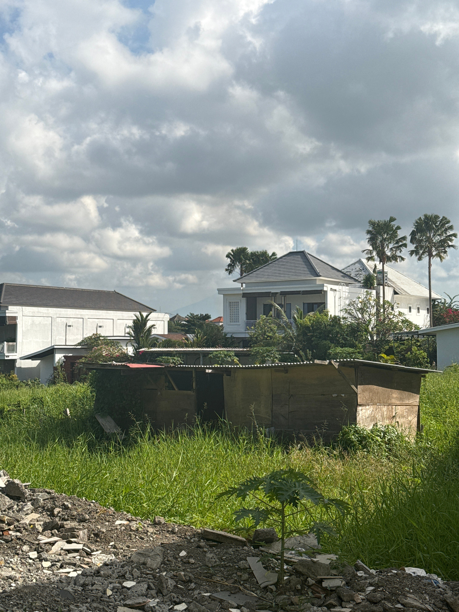 The image shows a residential area in North Kuta, Indonesia under a cloudy sky. Several white multi-story buildings with gray roofs are visible, interspersed with palm trees and lush greenery. A makes…read more