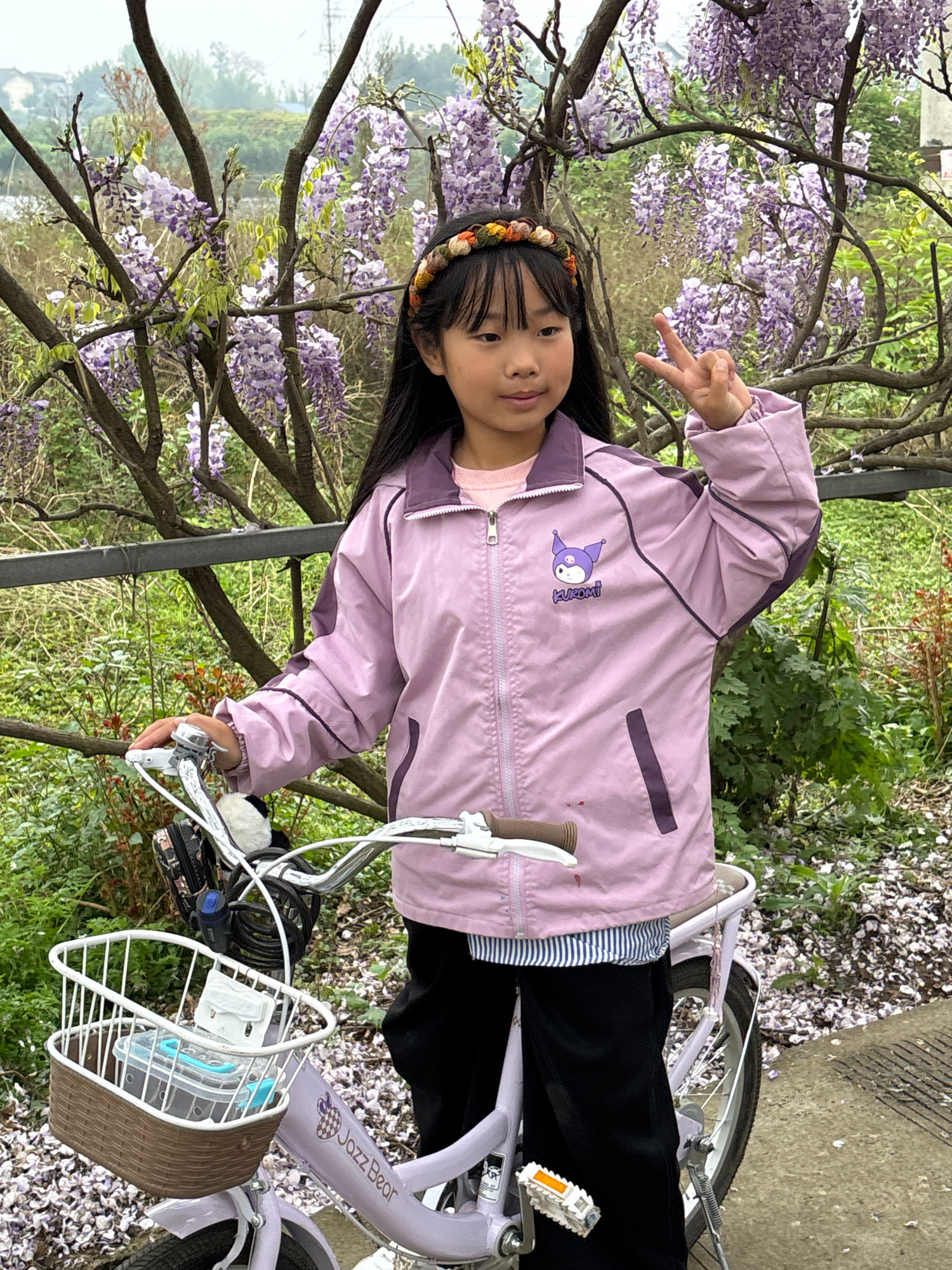 A young girl poses with a "peace" sign next to a lavender bicycle. She is wearing a lavender jacket with a "Kuromi" cartoon character on it and a flower crown. The bicycle has a basket with a light bl…read more