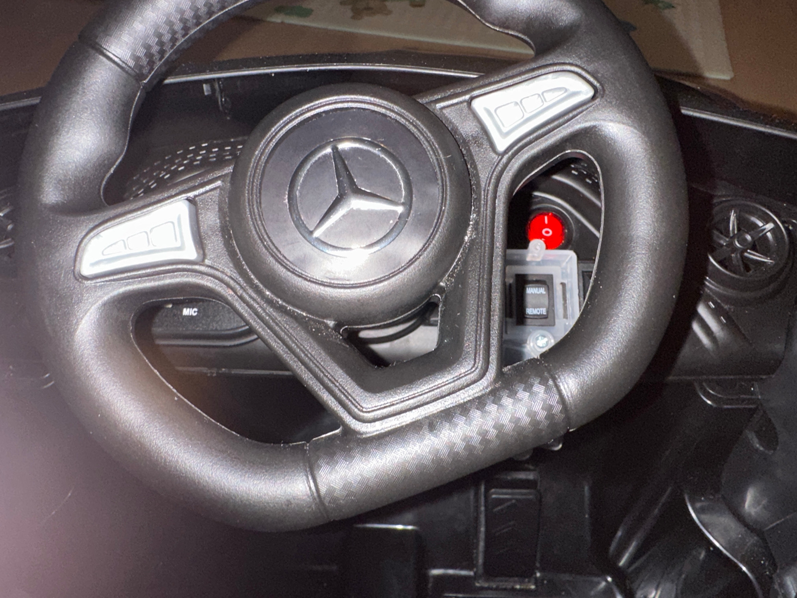 A close-up shot of a black steering wheel, likely from a toy car. The steering wheel features a Mercedes-Benz logo in the center. Adjacent to the central logo is a switch labeled "MANUAL/REMOTE" and a…read more