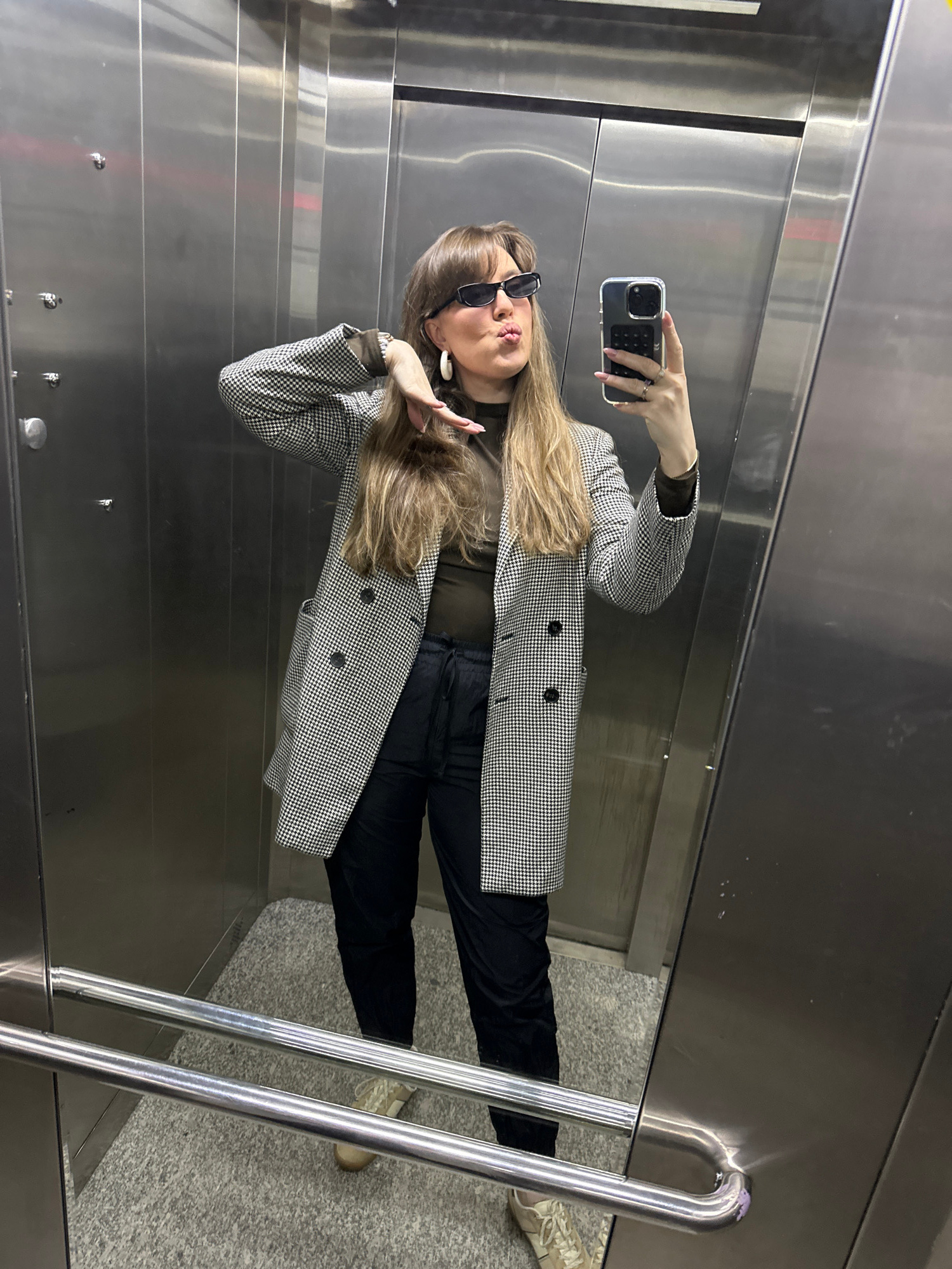 A woman is taking a selfie in an elevator. She is wearing a houndstooth blazer, black pants, and sunglasses. She has long blonde hair and is holding her phone in her right hand. She is posing, making…read more