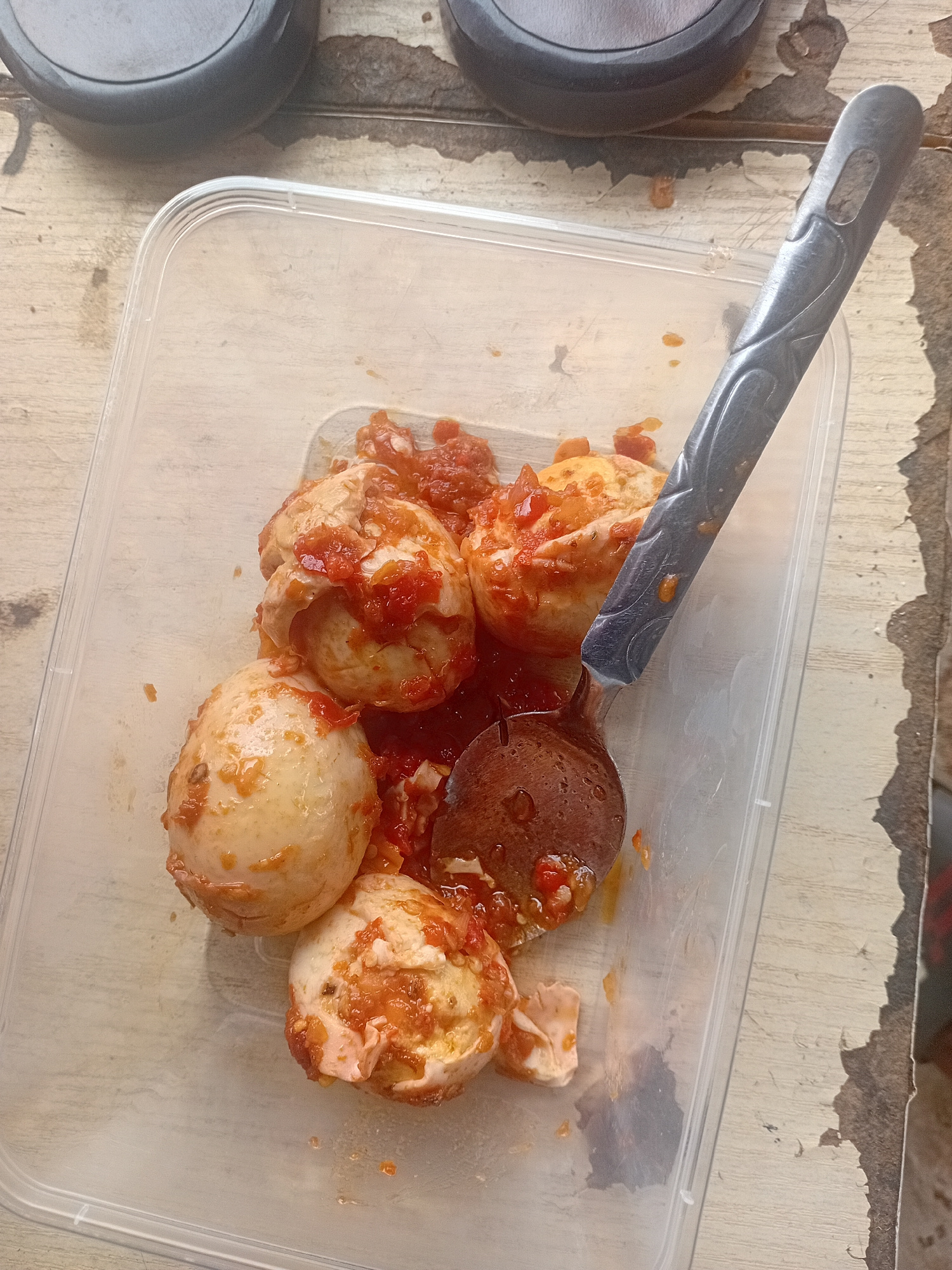 A close-up, high-angle shot shows a clear, rectangular plastic container holding several boiled eggs coated in a red, tomato-based sauce. A metal and wooden spoon rests inside the container. To the leβ¦read more