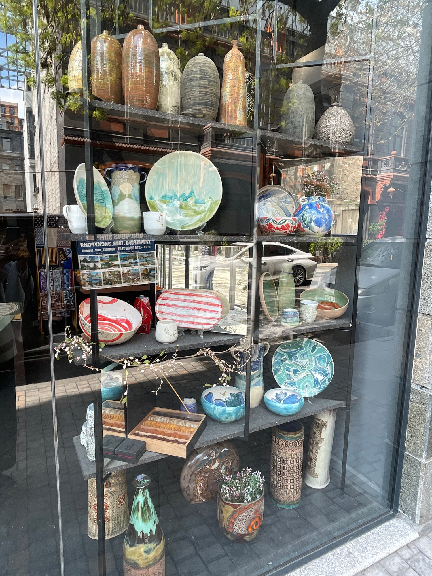 The image captures a storefront display, possibly in Yerevan, Armenia, containing various ceramic and glass items. The display is behind a glass window, reflecting the outside environment, including b…read more