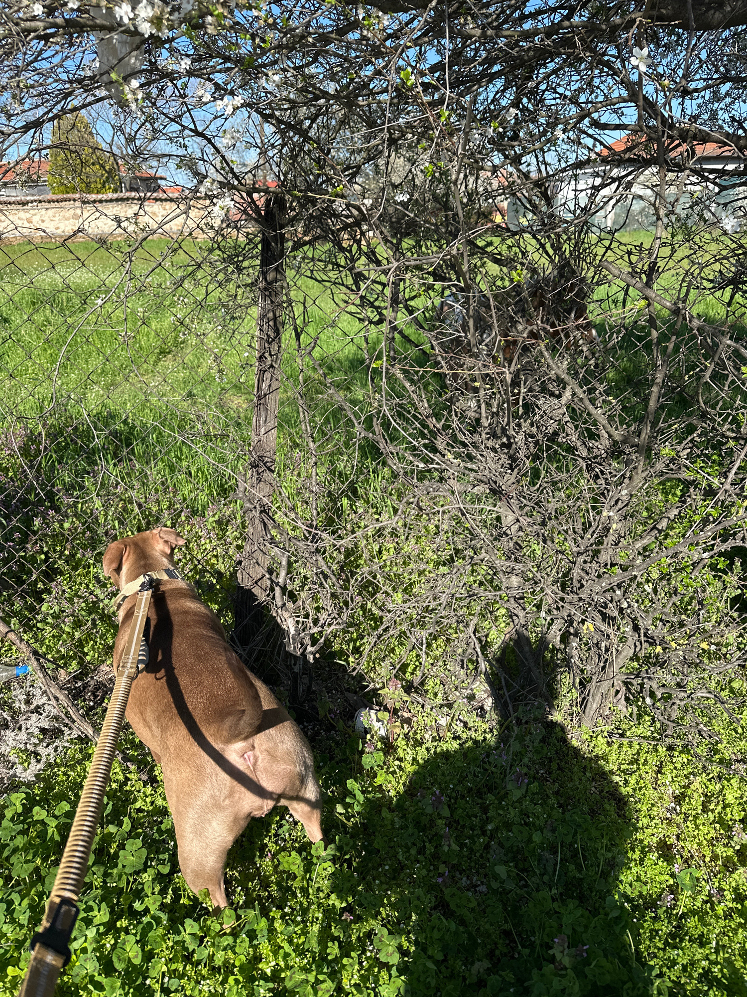 The image shows a brown dog lying in the grass in Malevo, Bulgaria. The dog has a leash attached to its collar. A wire fence is visible in the background, separating the dog from a tree with white blo…read more