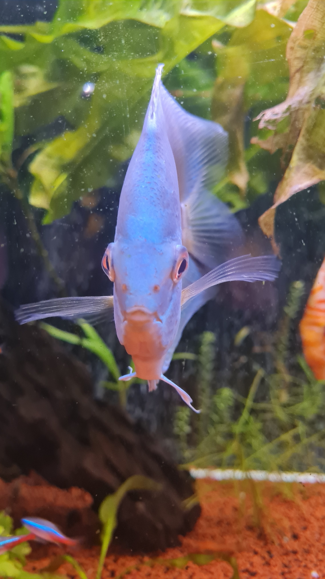 A fish, light blue in color with an orange head, is the main subject of the image. The fish is positioned in the center of the frame, viewed from a bottom angle. Its fins are translucent and elongated, extending from its body. The fish is in an aquarium setting with various aquatic plants visible in the background. The background includes green plants and some darker, possibly wood-like, elements. The water appears slightly cloudy with some particulate matter suspended in it. In the lower right corner of the image, the tail of another fish, exhibiting blue and red coloration, is partially visible. The location of the scene is Lachish Regional Council, Israel. | Open Wire