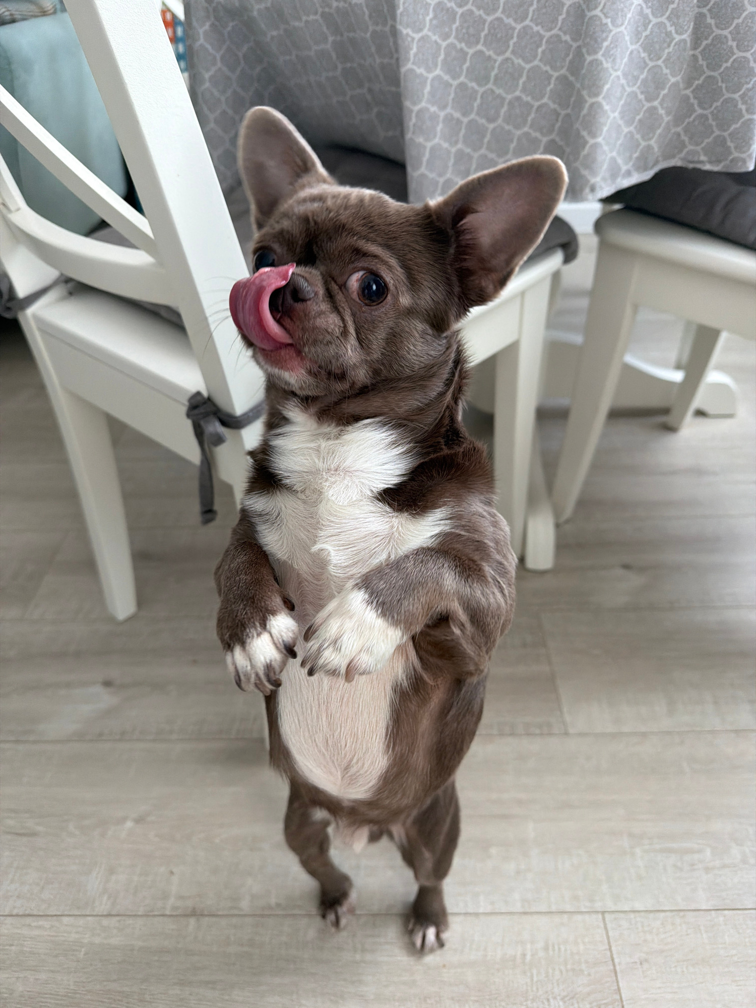 A brown and white Chihuahua dog is lying on its back on a light grey wood floor next to a white chair. The dog is sticking its tongue out. Part of the chair is visible behind the dog, and a cushioned…read more