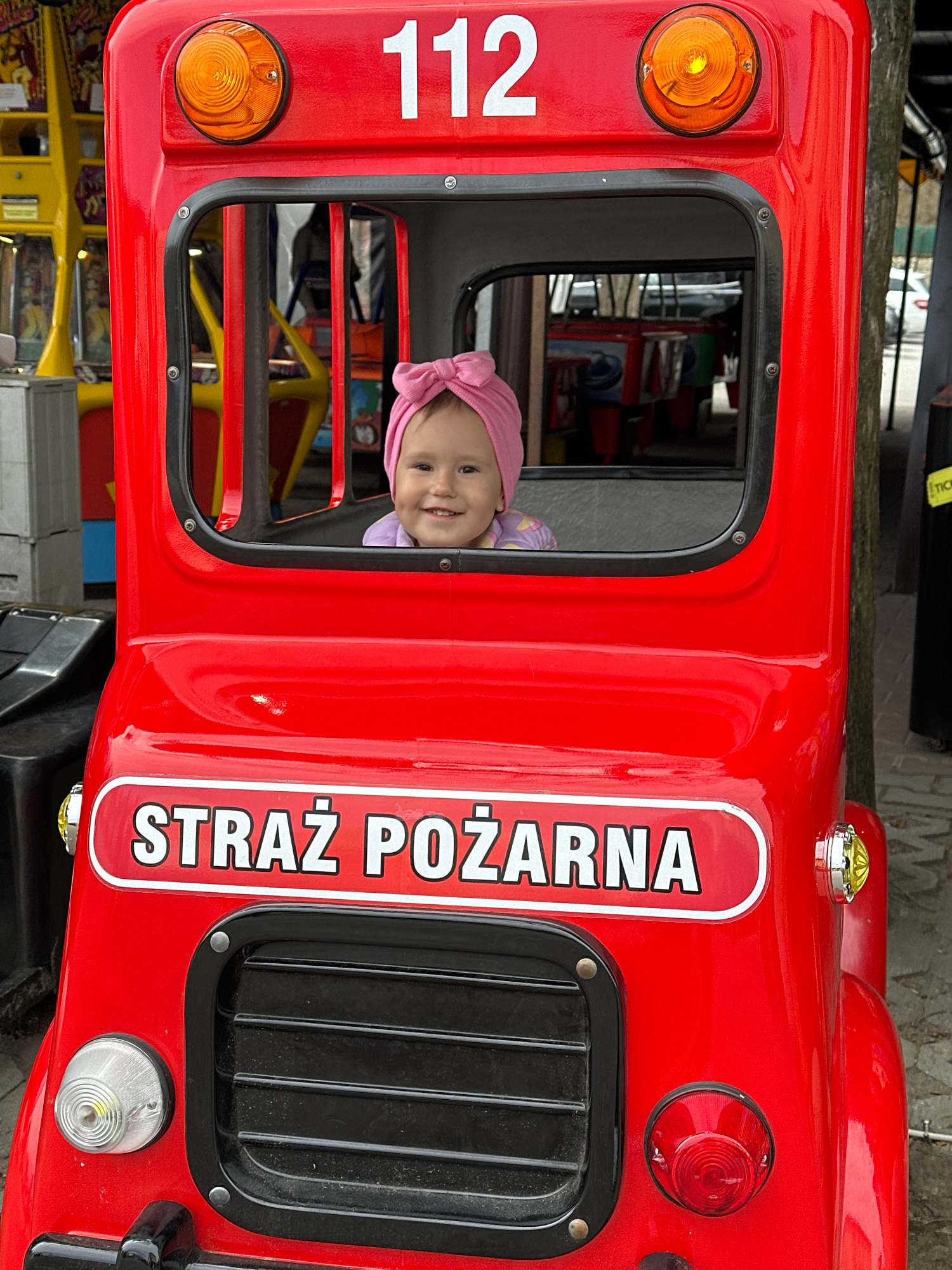 A red fire truck ride with the Polish words "STRAŻ POŻARNA" visible on the side, and the number "112" on the front, contains a baby wearing a pink bow in the driver's seat, located in Wisła, Poland.