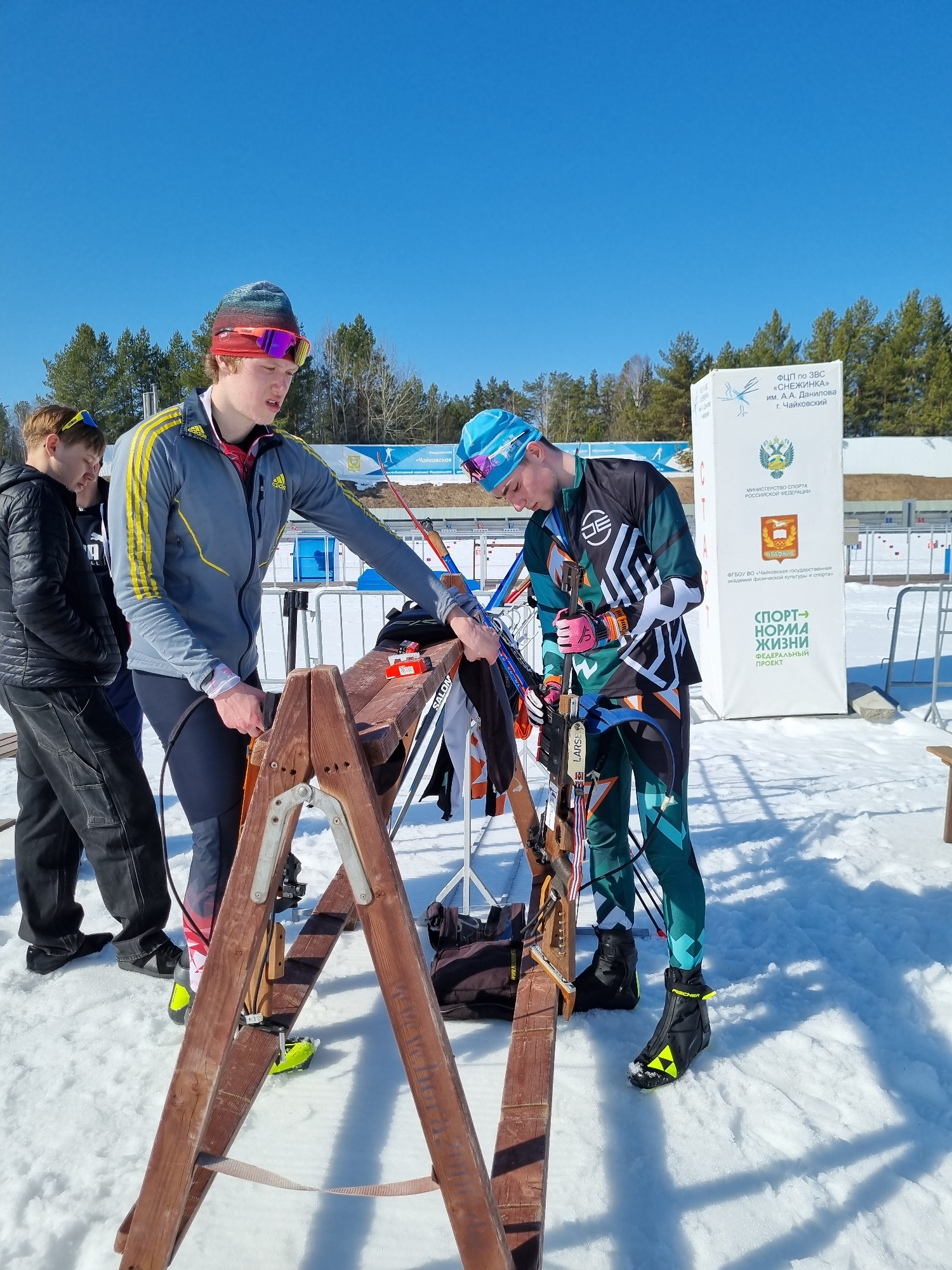 The image depicts an outdoor biathlon range at the "Snezhinka" Winter Sports Center in Chaykovsky, Perm Krai, Russia, under a clear blue sky. Two young males, dressed in athletic winter attire, are ac…read more