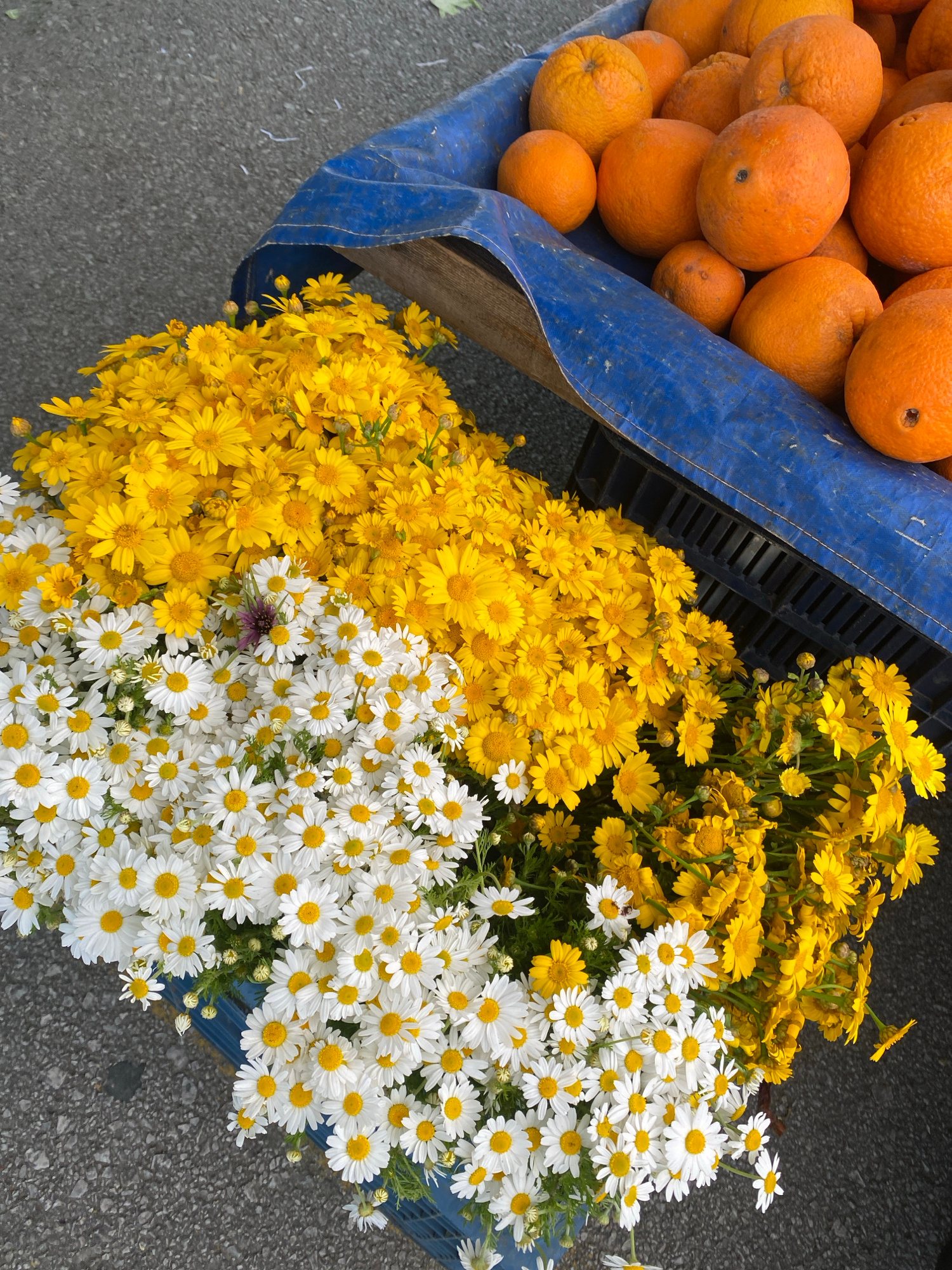 The image shows a blue plastic crate or bin filled with oranges and two types of flowers. On the left side of the crate are several oranges piled together. To the right are two groups of flowers: one…read more