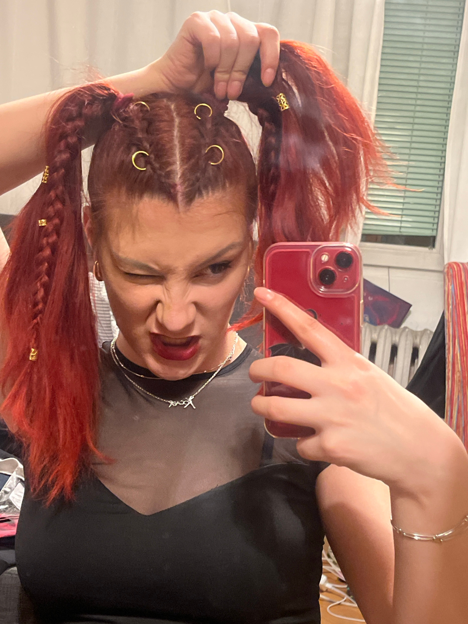 A person with red braided hair is taking a selfie. The person is holding a red phone and wearing a black top and silver jewelry. The location is not discernible.