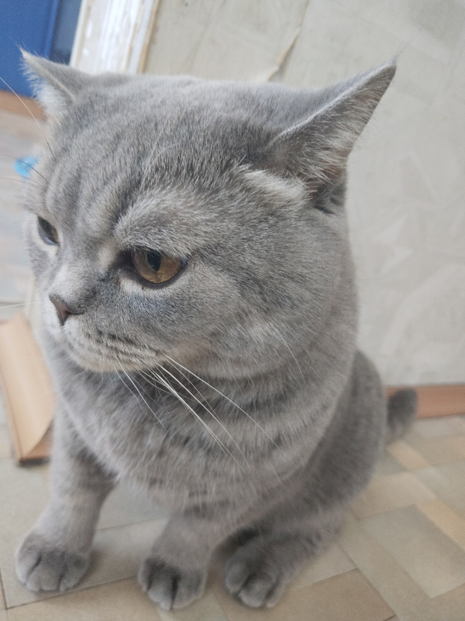 This close-up portrait features a domestic cat, likely a British Shorthair, with dense, solid grey (often called blue) fur. The cat is sitting upright, facing slightly to its left with an intent gaze.…read more