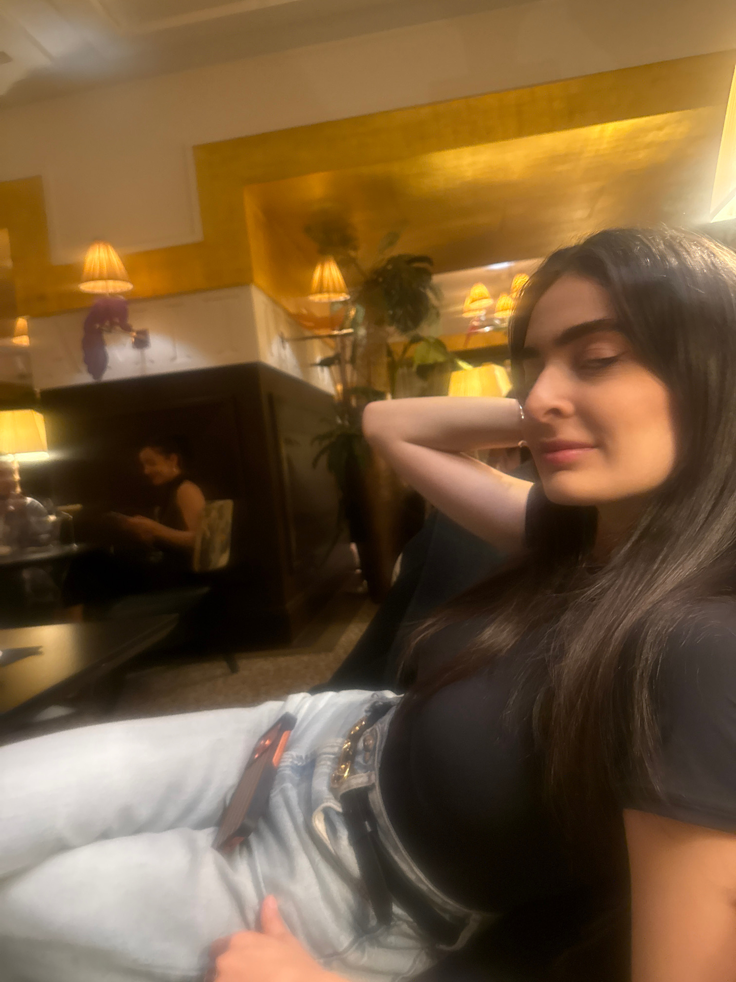 A young woman with long, dark hair is sitting at a table, leaning on her left arm. She is wearing a dark top and light blue jeans with a belt. A mobile phone is partially visible in her front pocket.…read more
