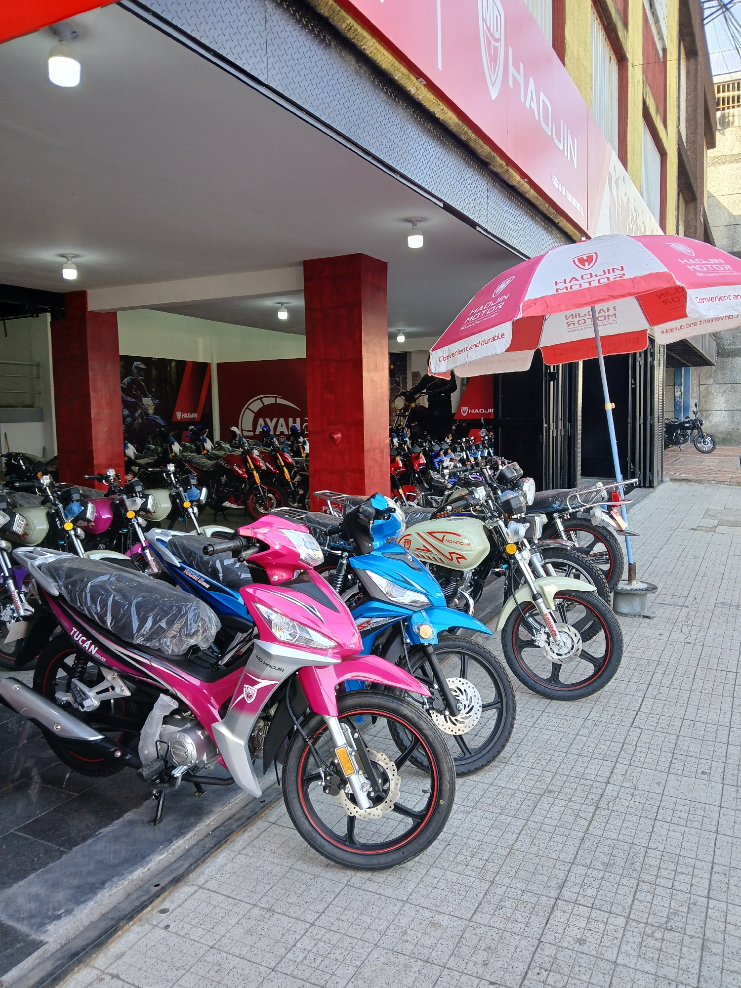 The image depicts a storefront for "Haodjin Motor" in Ciudad Guayana, Venezuela. The establishment is a motorcycle dealership or shop, indicated by the numerous new motorcycles lined up on the sidewal…read more