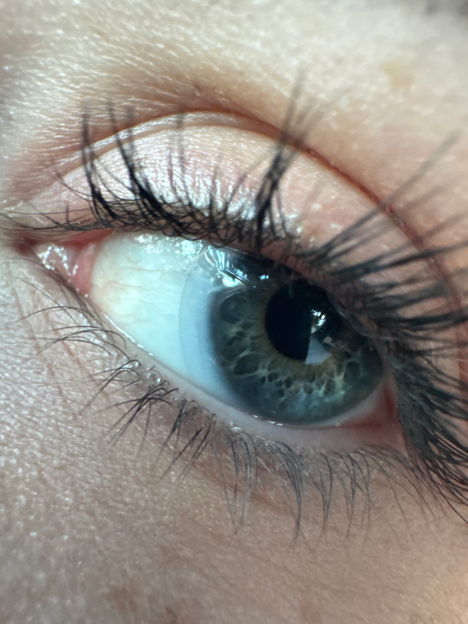 A close-up photograph shows a human eye, likely female, viewed from the side. The iris is a complex mix of blues, greens, and browns. The pupil is dark and reflects light. Eyelashes are long and dark…read more