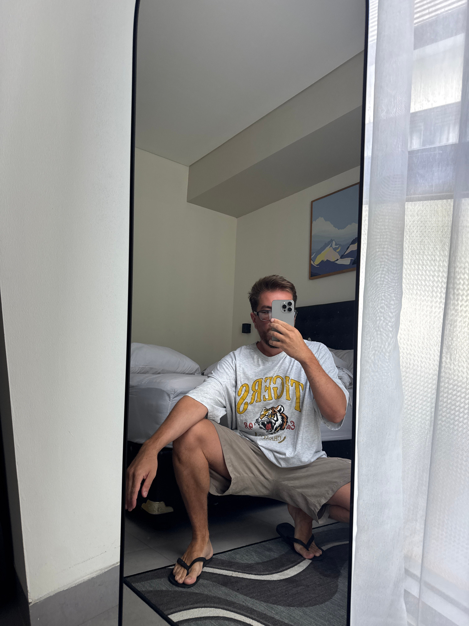 A mirror selfie of a man is reflected, showing him crouching on a black surface, possibly a piece of luggage. He wears a gray T-shirt with a tiger graphic, khaki shorts, and black flip-flops. He is ho…read more