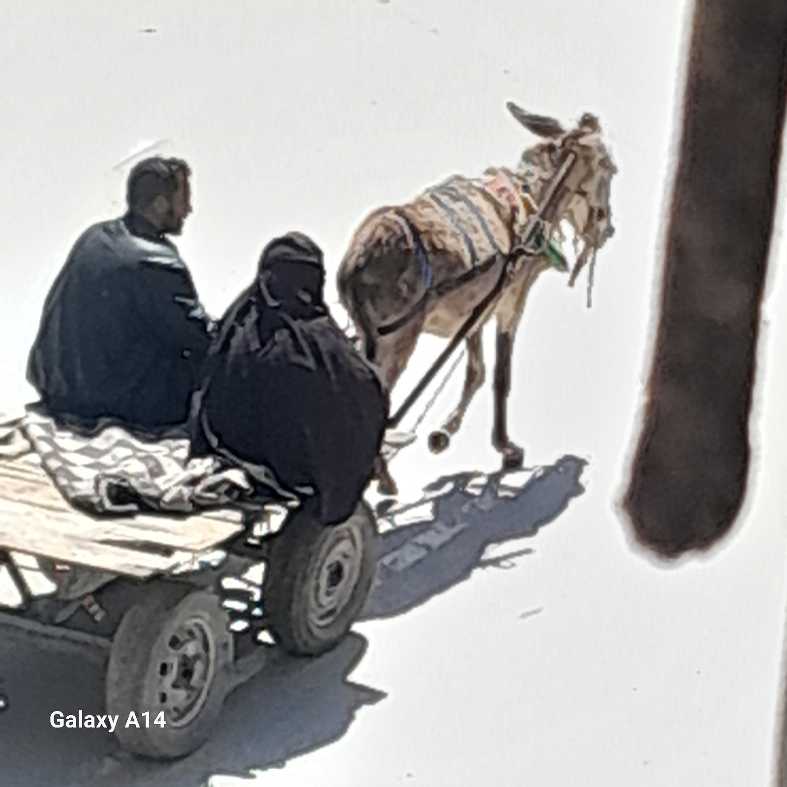 The image shows a donkey pulling a cart in Khan Yunis, Palestinian Territory. A man is riding on the cart. The donkey is wearing decorative coverings. The cart has two wheels. The photo appears to hav…read more