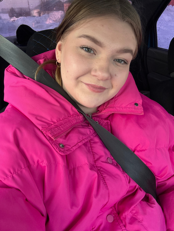 The image depicts a young female inside a vehicle, located in the city of Фоки, Russia. The subject, a Caucasian female with light brown hair and light-colored eyes, is visible from the chest up, occu…read more