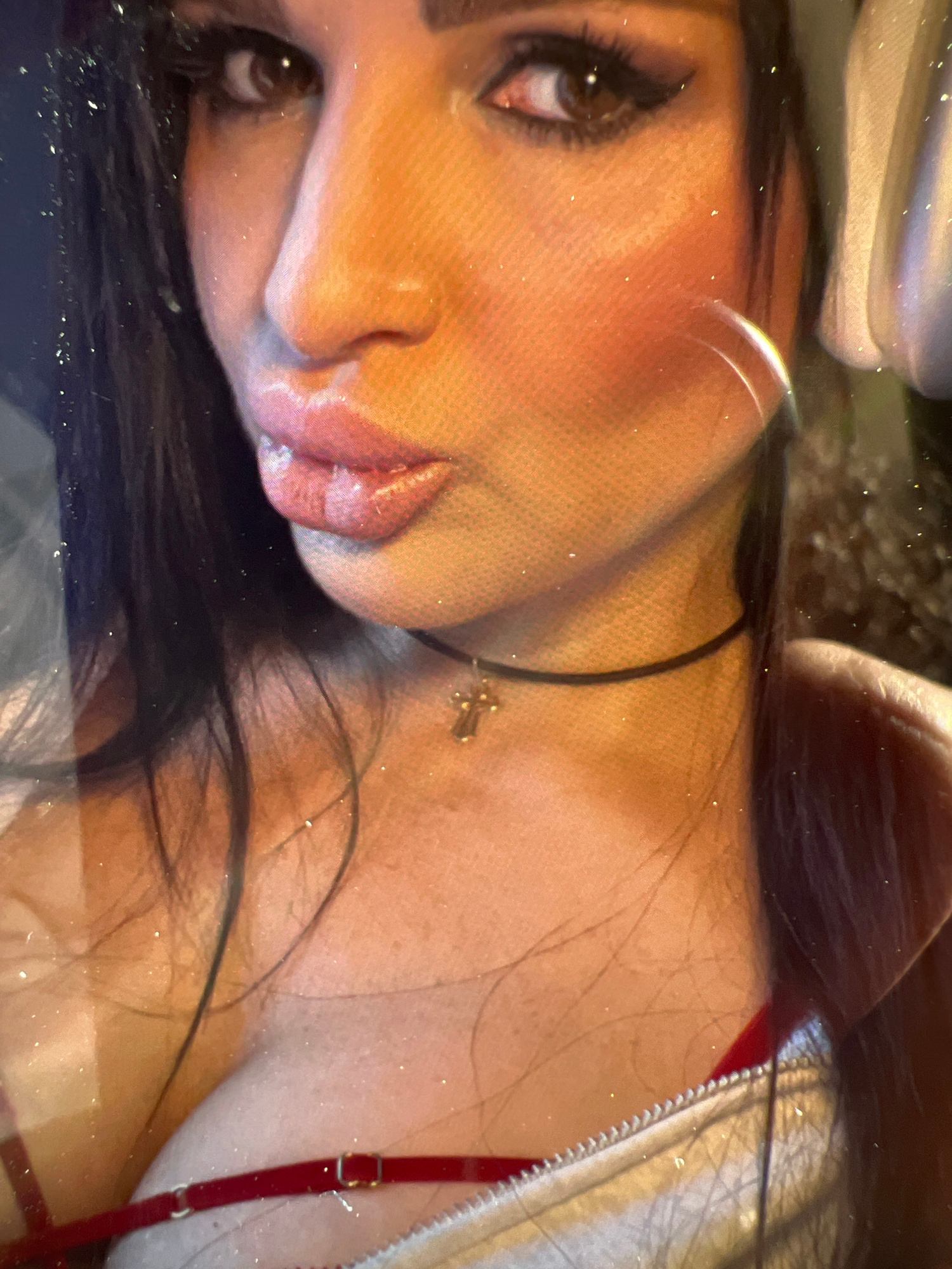 A close-up portrait of a woman. She has dark hair and fair skin. She is wearing a black choker with a small gold cross pendant. A red strap from an article of clothing is visible on her shoulder. Theβ¦read more