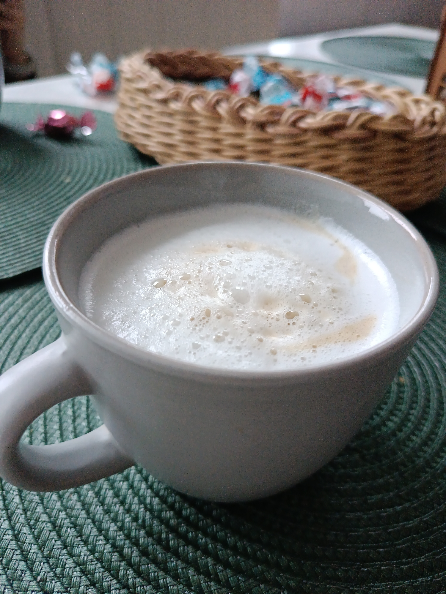 The image depicts a close-up of a cup filled with a frothy white beverage, possibly a latte or cappuccino. The cup is gray and has a handle on the left side. It sits on a dark green, textured placemat…read more