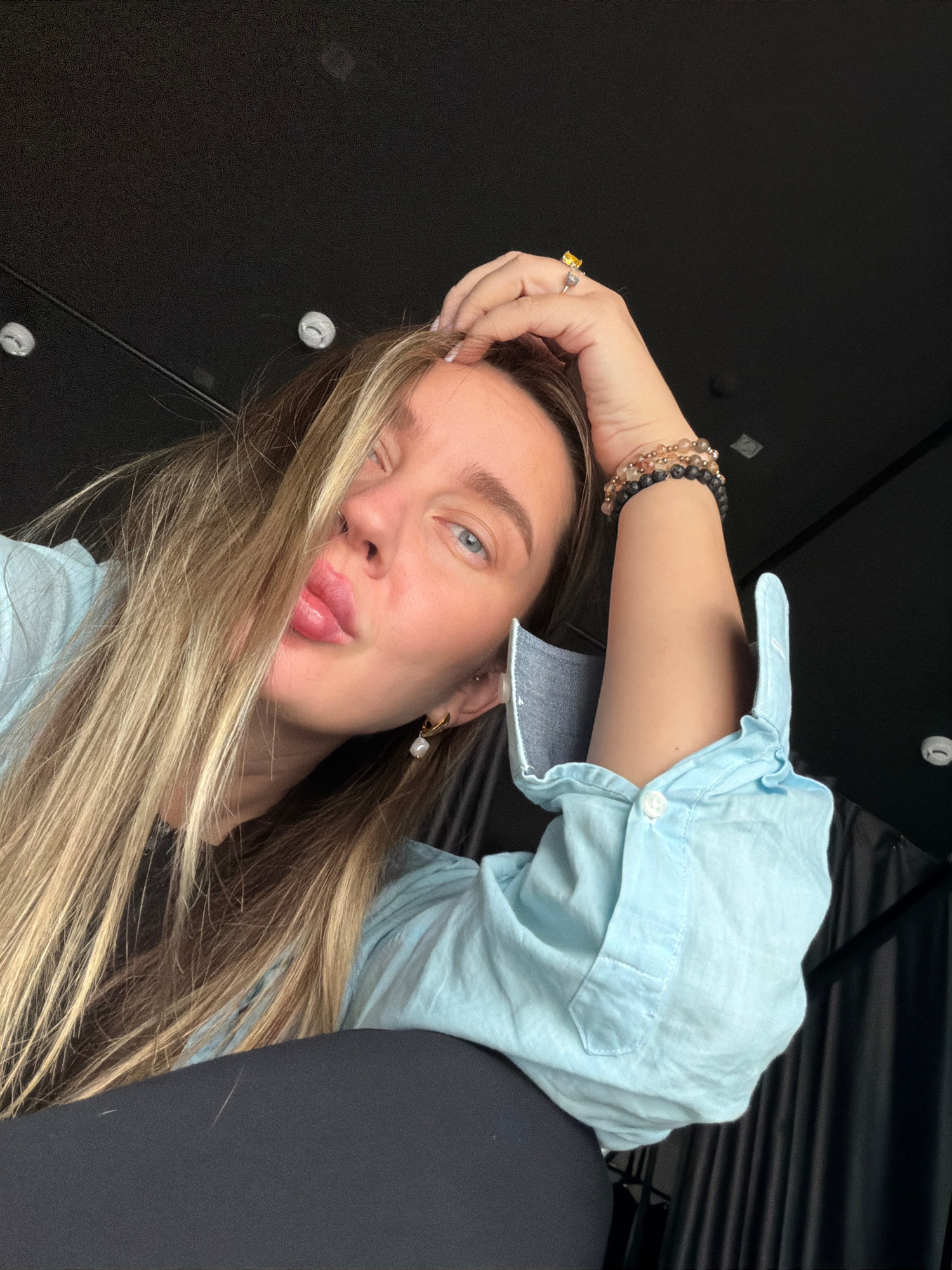 A young woman with long, blonde hair is reclining in what appears to be the interior of a car, possibly a taxi, with black leather seats visible on the right side of the frame. She is wearing a light…read more