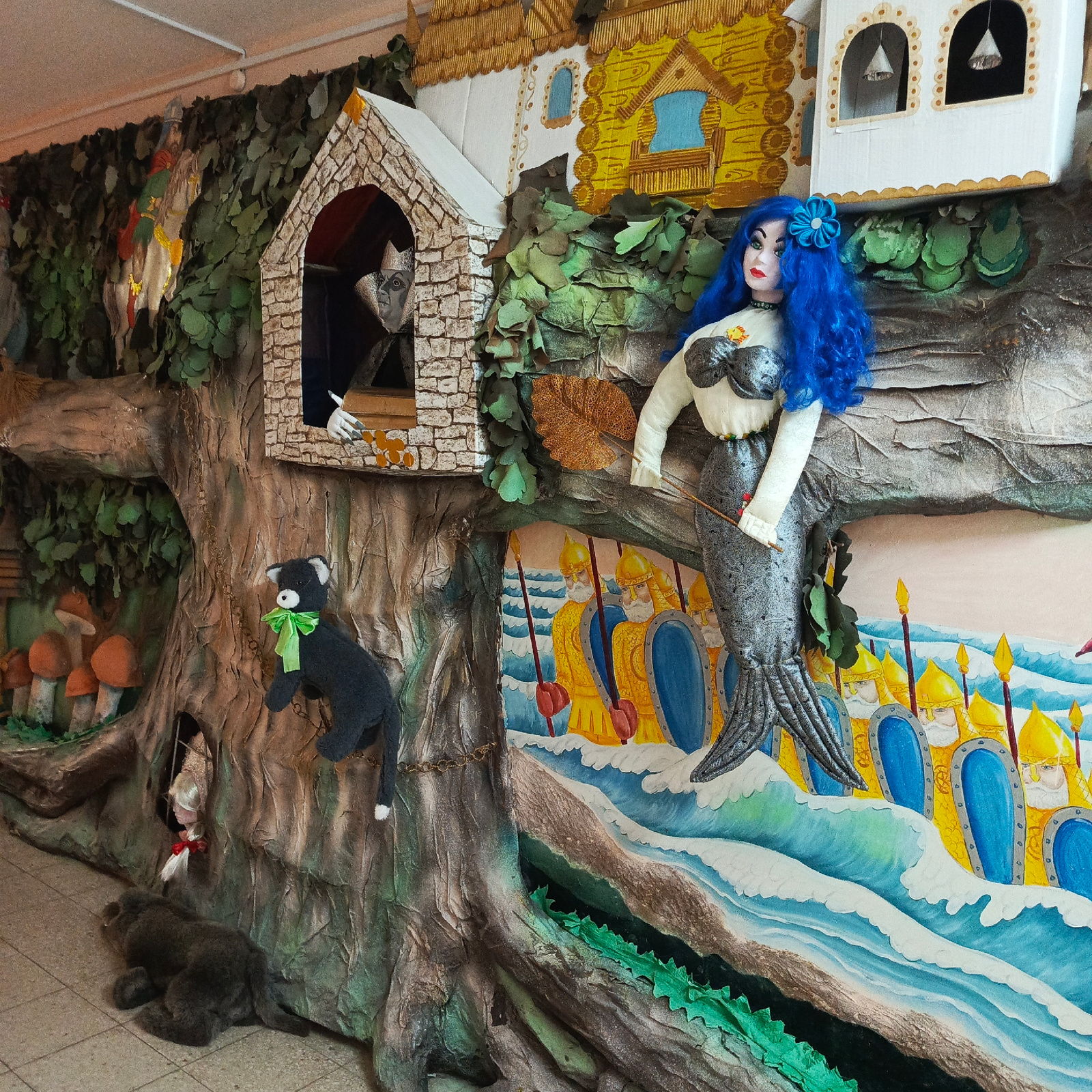 The image shows a large, elaborate, somewhat surrealistic, wall-mounted display in Markovskii, Russia. It appears to be a diorama depicting scenes from Russian fairytales. **Subjects and Objects:**…read more