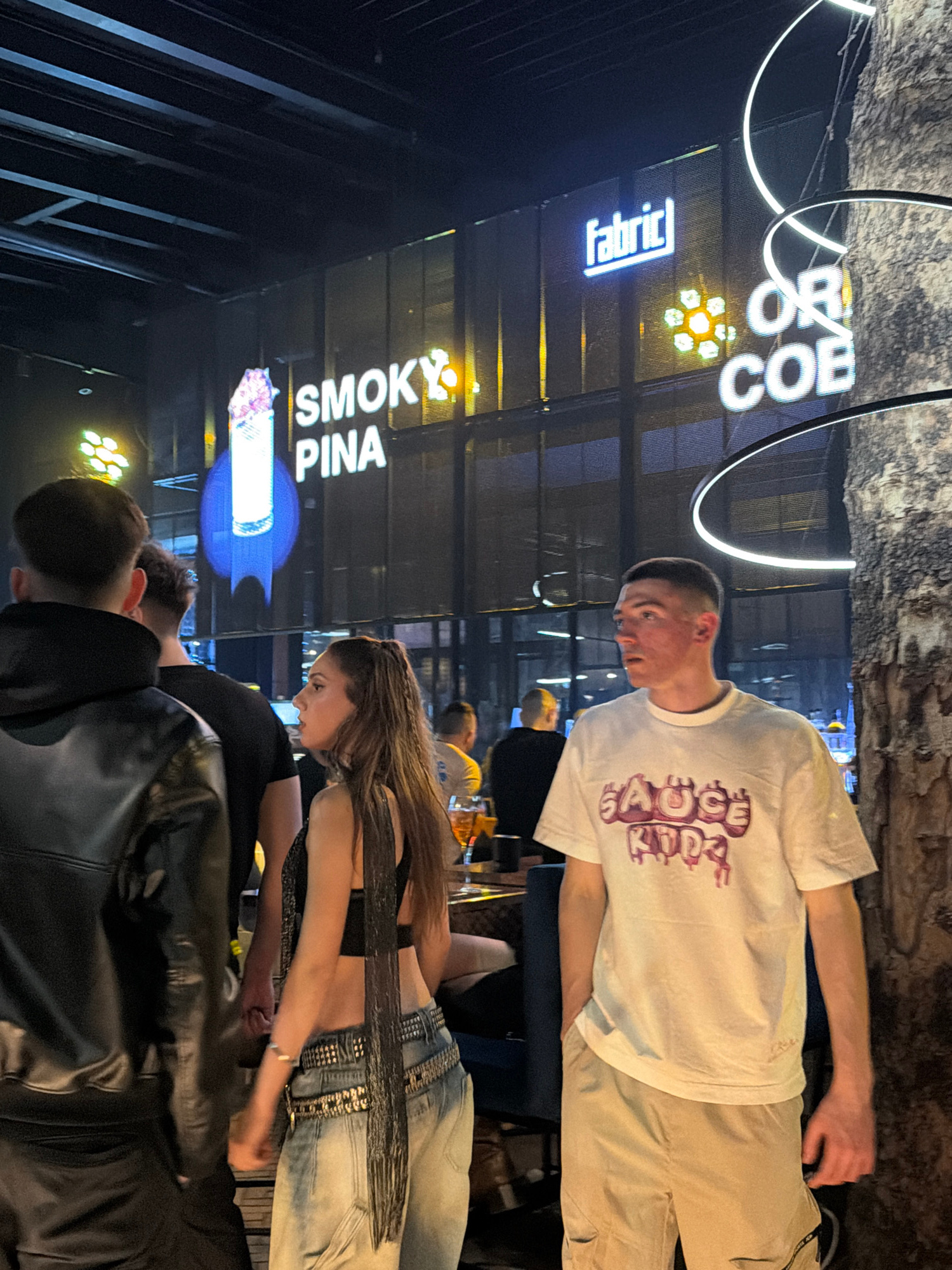 The image depicts a scene in a dimly lit indoor setting, possibly a bar or club, with several individuals present. A young man in a white t-shirt with a graphic design stands to the right. In the fore…read more