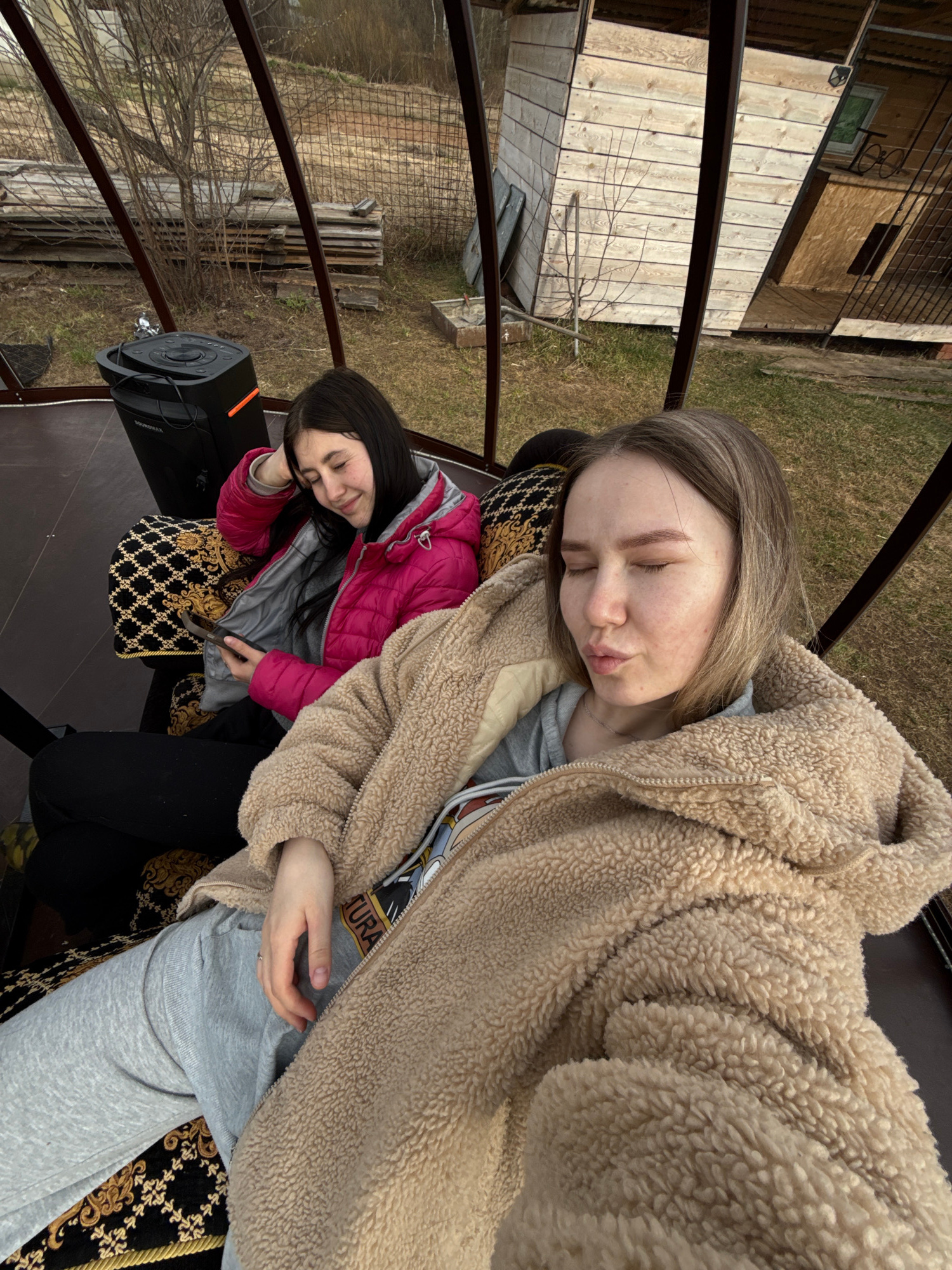 Two young women are depicted resting outdoors, likely on a patterned bench or swing, in what appears to be a rural or semi-rural setting. The image is captured from an overhead perspective, looking do…read more