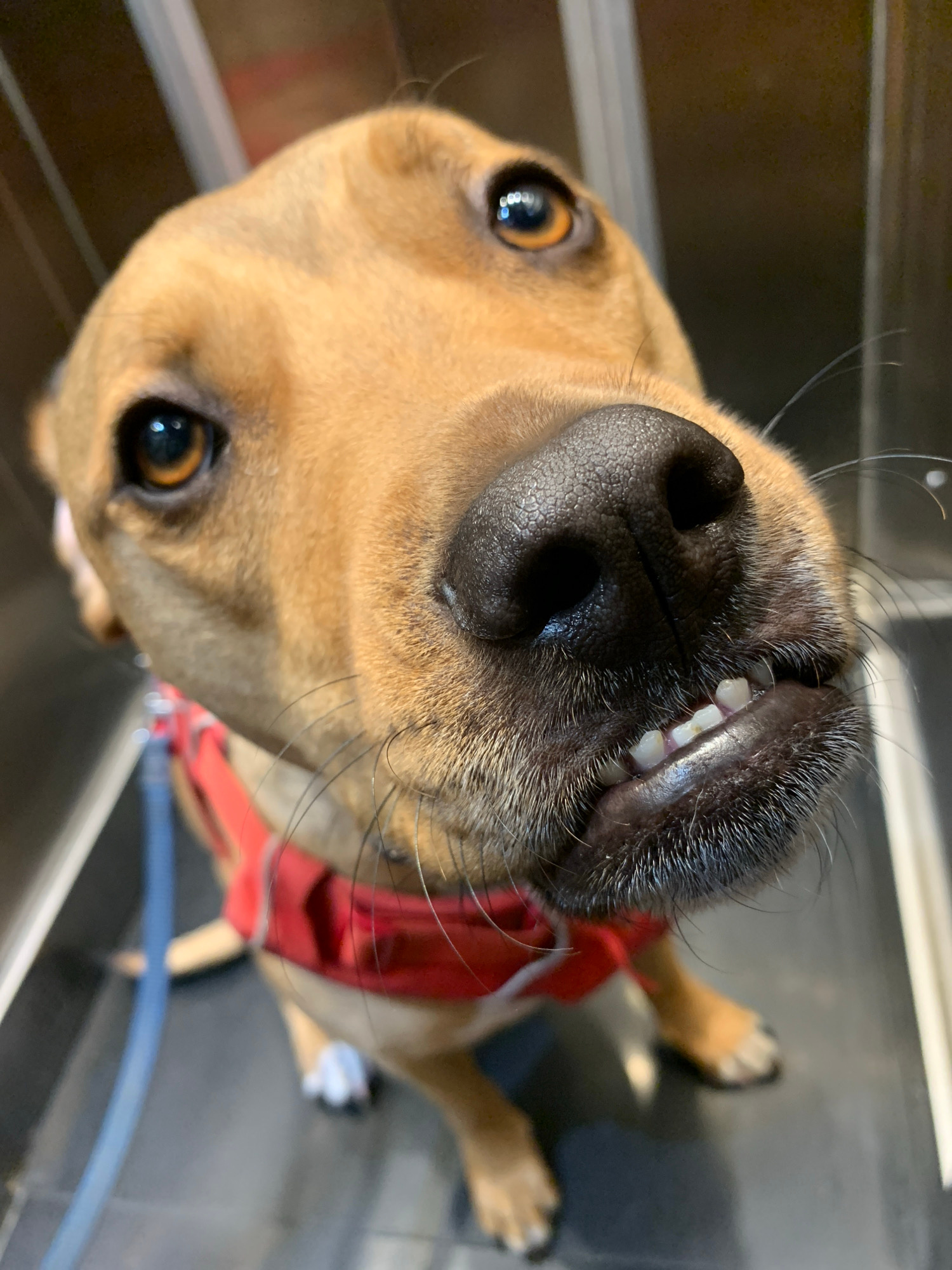 A close-up, low-angle shot captures the face of a light brown or tan dog lying down indoors. The dog's snout and black nose are prominently featured in the foreground, creating a wide-angle, slightly…read more