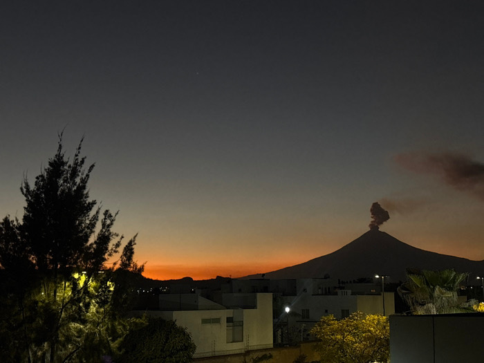 A dusky landscape features a silhouetted volcano emitting a plume of smoke, set against an orange and gray twilight sky. Buildings and trees, some illuminated by streetlights, occupy the foreground. A…read more