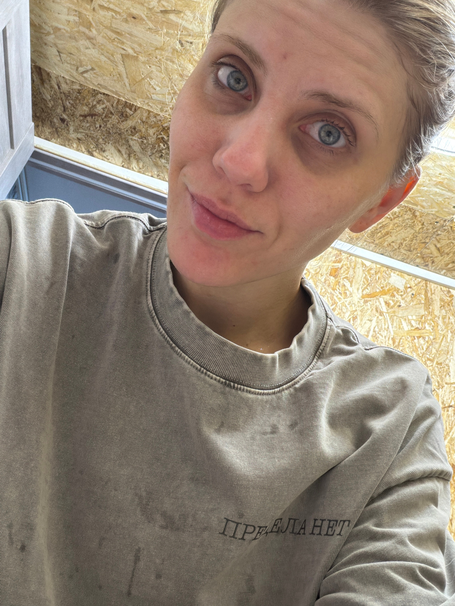 A close-up, slightly angled selfie shows a fair-skinned woman with light blonde hair pulled back, and blue eyes. She is wearing a light gray, crew-neck sweatshirt that has some stains on it. In Russia…read more